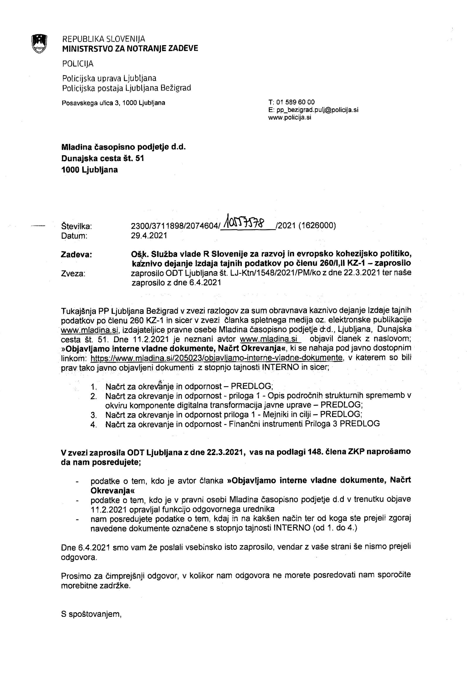 To so bili torej razlogi za kritiko in objavo. Iz Černačeve službe, iz katere so slovenski načrt za okrevanje medtem že poslali v Bruselj, pa so zaradi Mladinine objave na državno tožilstvo vložili ovadbo zaradi izdaje tajnih podatkov na podlagi 260. člena kazenskega zakonika, ki za takšne kršitelje zahteva kazen do treh let zapora.