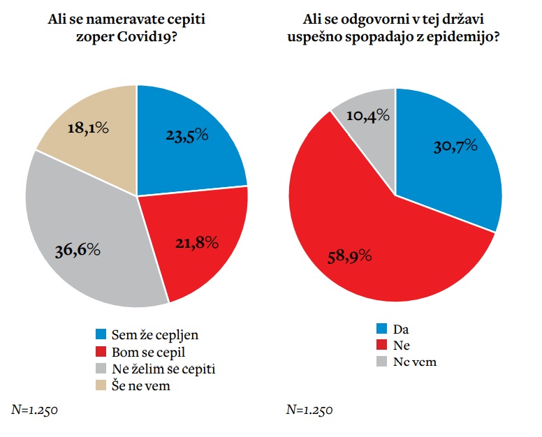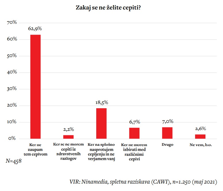 Tudi raziskovalci družbe Valicon so z anketo, ki je zajela 1042 necepljenih oseb, preverjali njihov odnos do cepljenja in vzroke zanj; rezultate raziskave najdete na spletni strani Sledilnika covid. Kar 81 odstotkov jih je do cepiv zadržanih, ker jih skrbijo stranski učinki, kot so krvni strdki, dve tretjini jih verjame, da lahko povzročijo nepredvidene zaplete pri otrocih. Raziskava je potrdila, da so nasprotniki cepljenja, šlo je predvsem za ljudi v srednjih letih in mlajše, zelo nezaupljivi do farmacevtske industrije, pa tudi do politikov. Tako se je 63 odstotkov vprašanih strinjalo, da »avtoritete promovirajo cepljenje zaradi tehničnih dobičkov, ne zaradi zdravja ljudi«, 62 odstotkov vprašanih pa se je izreklo, da ne zaupa vladnim zagotovilom o varnosti in učinkovitosti cepiva; dobra polovica anketirancev in anketirank še meni, da »pomenijo programi za cepljenje veliko zavajanje«. Skoraj polovica vprašanih se nikakor ne namerava cepiti, 37 odstotkov bi o tem še premislilo.