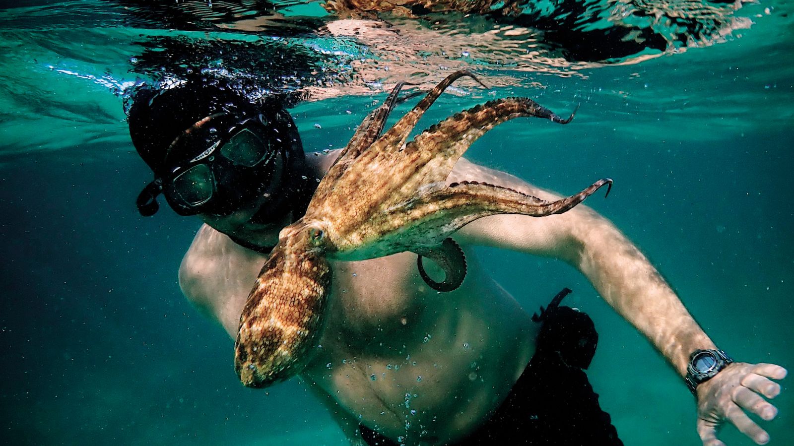 Da bi se kdo sprijateljil s hobotnico? No, s tisto iz bondiade Octopussy že, toda z morsko – njet. Tale doku, ki je nedavno dobil oskarja, pa nam pokaže prav to – ultimativno bližnje srečanje tretje vrste. Tam spodaj, v tistem hladnem algastem gozdu (Cape of Storms), je tako lepo kot v dokujih Davida Attenborougha, trenutek, ko se začneta Craig Foster, južnoafriški okoljevarstvenik v krizi srednjih let, ki je potreboval le malce terapevtske samote (na dah, brez potapljaške opreme), in hobotnica, to čudno brezoblično bitje, ki je tako patetično kot lucidno (čakajte, da nategne morskega psa!) in ki se je milijone let učilo nevidnosti, nežno dotikati in objemati, pa vas bo spomnil na najganljivejše dotike iz filmov Jurski park in E. T., le da hobotnica, mali, igrivi, podjetni, inteligentni osmi potnik, ni specialni efekt.