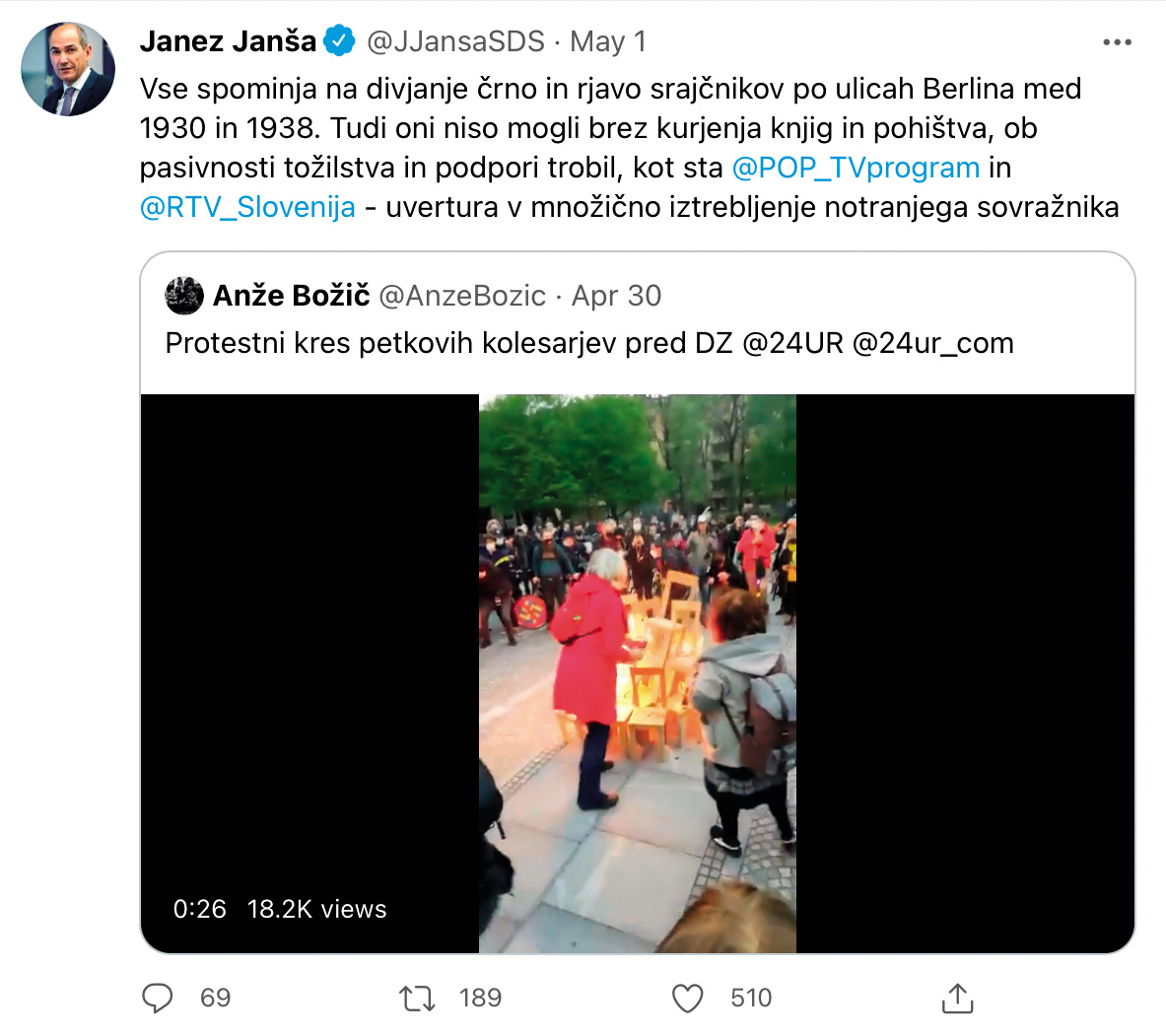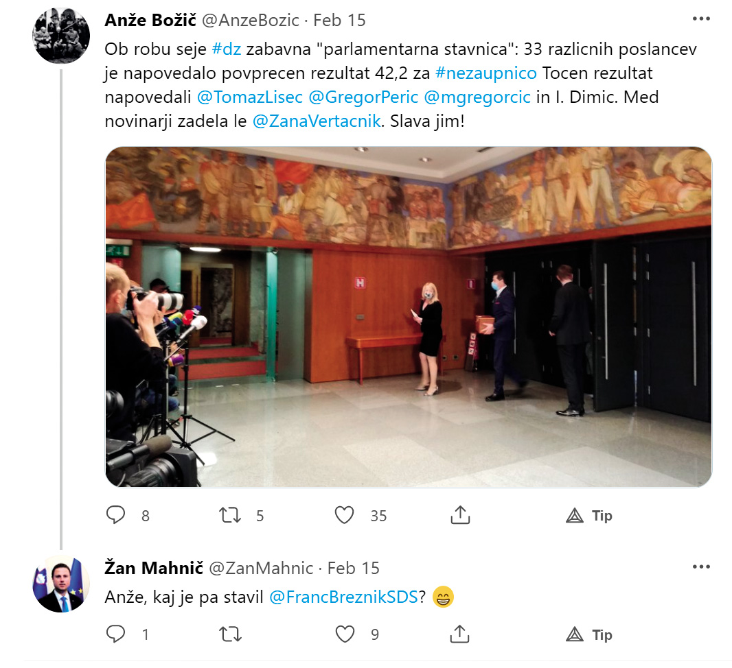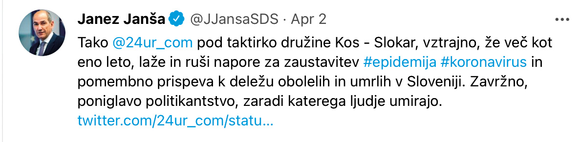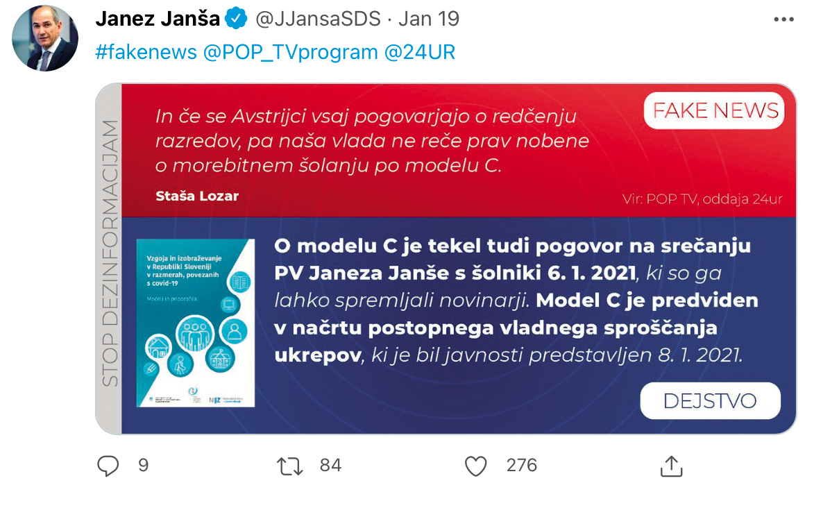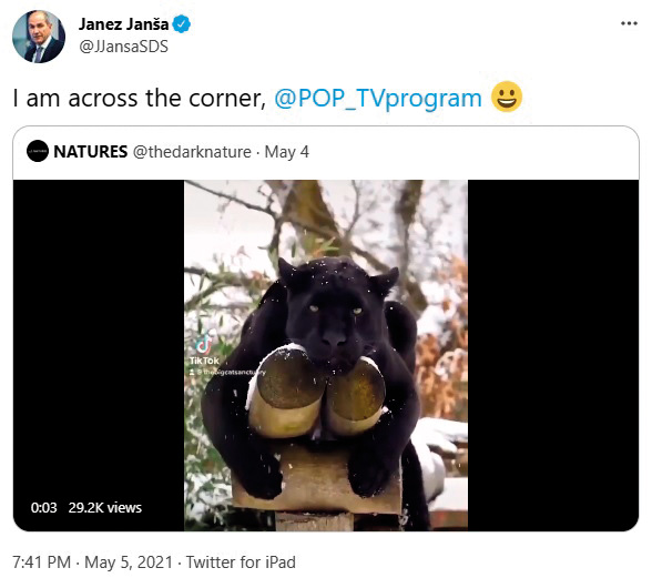 Nad tem medijem se sicer Janša rad pritožuje tudi povsem javno, na Twitterju. Najslavnejši je njegov čivk s sliko črnega panterja, v katerem je sporočal novinarjem in lastnikom POP TV v angleščini: »Za vogalom sem.« Prav tako smo bili v zadnjih mesecih priča vrsti kvazi šaljivih, zaneseno oblastniških ali ciničnih izpadov članov SDS na račun novinarjev tega medija. Znan je incident, do katerega je prišlo februarja v parlamentu: novinar POP TV Anže Božič je pred glasovanjem o nezaupnici vladi zbiral stave poslancev, kako se bo vse skupaj izteklo. Nato je k njemu pristopil poslanec SDS Franc Breznik in zbranim v preddverju glasno dejal, da pa on stavi na zamenjavo direktorja in odgovorne urednice informativnega programa POP TV. »To piši,« je dejal Breznik, se spominja Božič. »Anže, kaj pa je stavil Franc Breznik« je kasneje šaljivo na Twitterju zapisal še Janšev svetovalec za nacionalno varnost Žan Mahnič, kot da je že tako ali tako vse jasno.