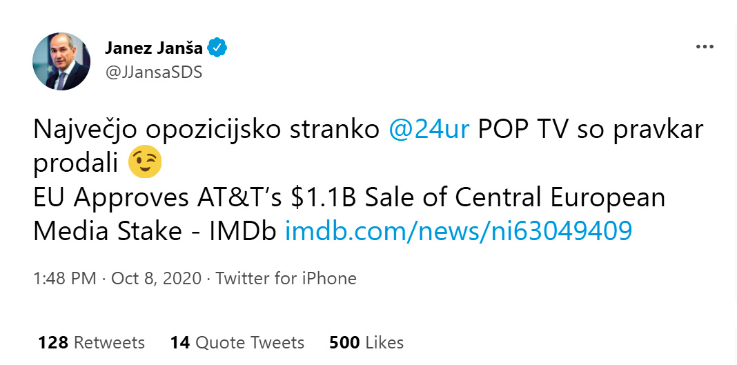 Čehi so lani oktobra Janši obljubili POP TV z novo kadrovsko zasedbo, bolj po meri SDS. Od tod tudi njegova samozavest, da si bo podredil televizijo, ki je na družbenih omrežjih niti ne skriva več.