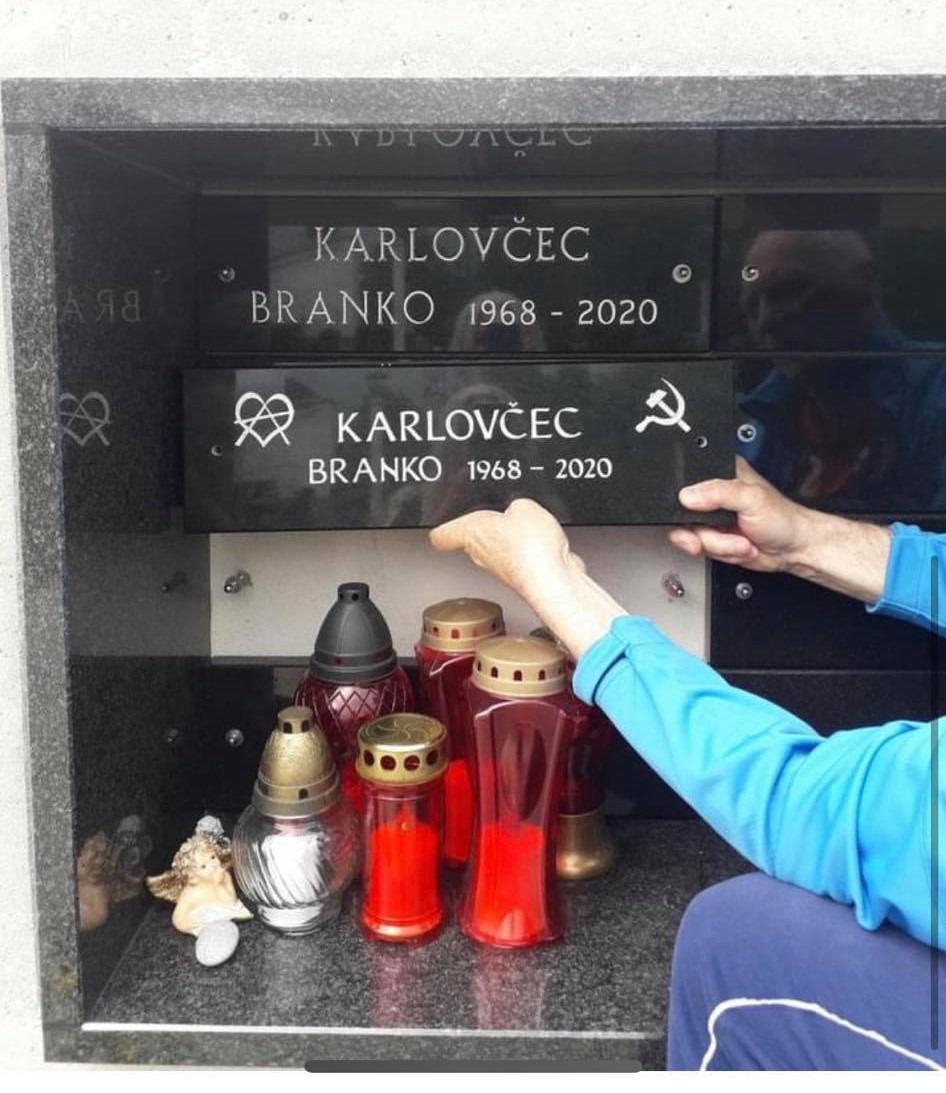 Ta simbol in pa anarhistični simbol, upodobljen v srčku, ki je bil prav tako na plošči, je poleg imena pokojnega moža dala vanjo vklesati Ivi Špelko. To se je zgodilo konec lanskega leta, ko je umrl njen mož Branko Karlovčec, panker, garač in tudi eden izmed mariborskih vstajnikov, ki so pred leti »napadli« občinsko stavbo in s tem sprožili vseslovenske vstaje. Nagrobna plošča stoji na zidu ob na novo urejenem prostoru za raztros na pokopališču v Kidričevem. Oziroma je stala. Brankova vdova je pred dnevi ob obisku pokopališča ugotovila, da nagrobne plošče ni več, namesto nje zdaj stoji nova, skorajda enaka kot prej, le brez dveh simbolov.