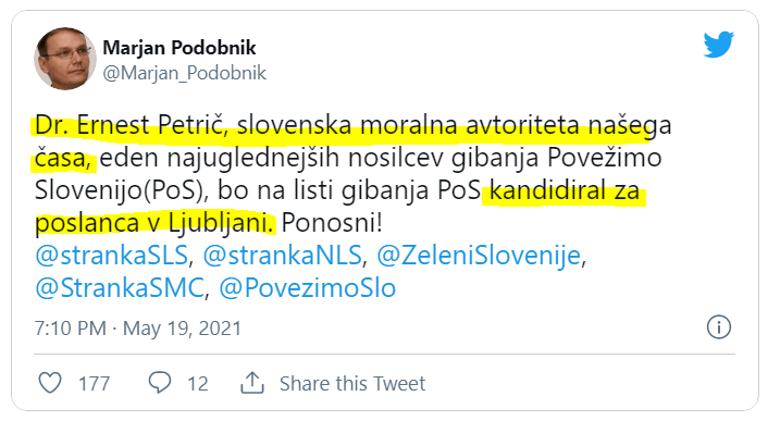 Dr. Ernest Petrič, slovenska moralna avtoriteta našega časa, eden najuglednejših nosilcev gibanja Povežimo Slovenijo(PoS), bo na listi gibanja PoS kandidiral za poslanca v Ljubljani. Ponosni! @strankaSLS, @strankaNLS, @ZeleniSlovenije, @StrankaSMC, @PovezimoSlo