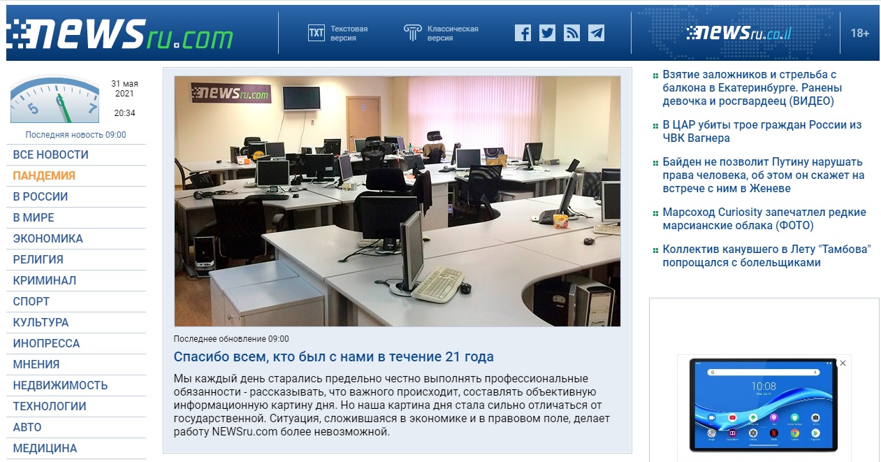 Eden od najstarejših neodvisnih medijskih portalov v Rusiji newsru.com je zaradi vse močnejših političnih pritiskov prenehal z delovanjem
