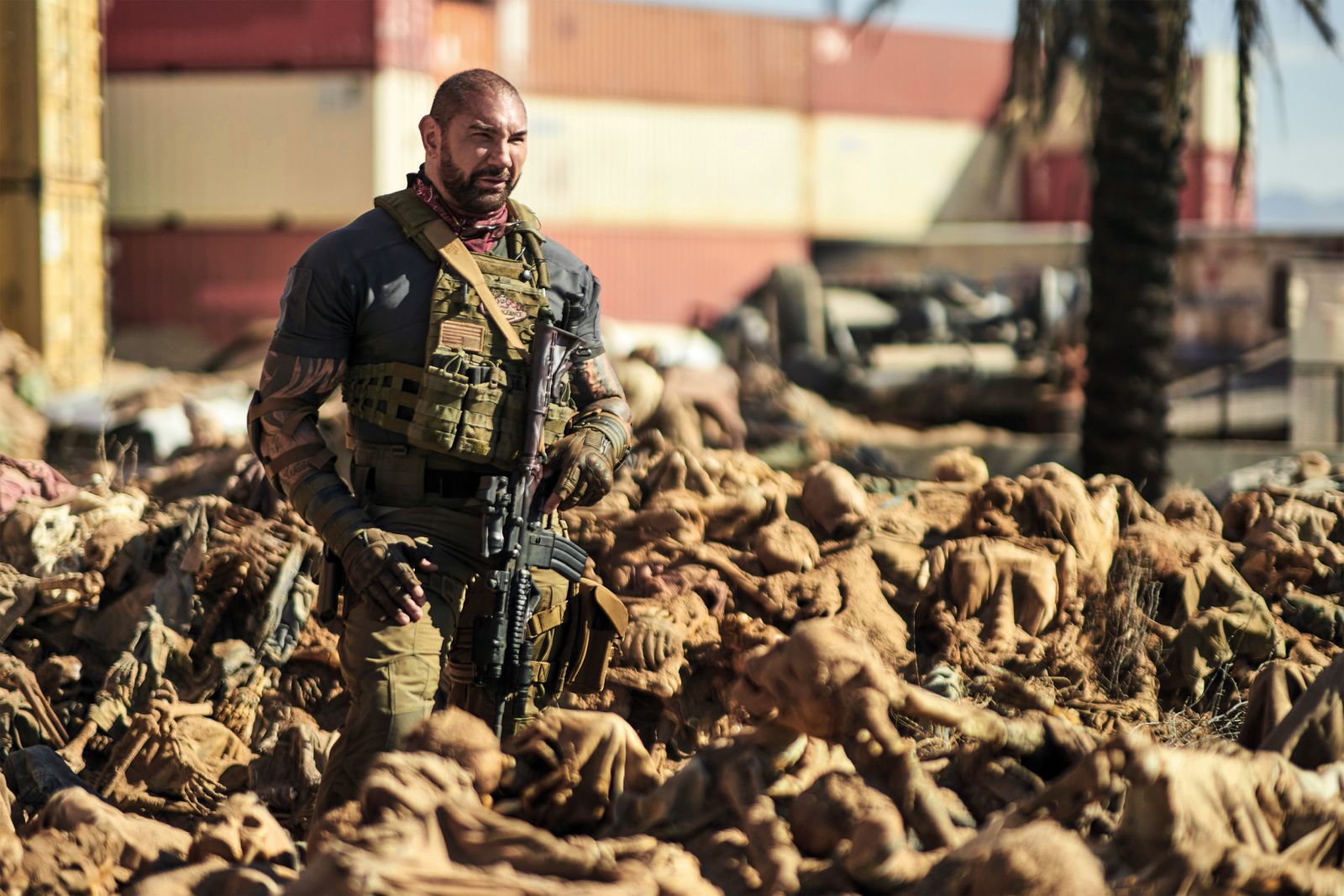 Zombiji, kakršne vidite v Snyderjevem spektakularnem nadaljevanju Zore živih mrtvecev, bi se sijajno podali Marvelovim Maščevalcem – Hulku, Thoru, Stotniku Ameriki, Iron Manu, Sokolu in Črni vdovi. Videti so namreč superjunaško – hitri so in eksplozivni, inteligentni in vsevidni, močni in neuničljivi, produkti tajnega vojaškega laboratorija ( ja, Area 51). Še zlasti Zeus (Richard Cetrone), njihov strašni, res karizmatični bog. Kdo se ne bi hotel slikati z njim? Na začetku požrejo kičasti, neonski, trumpovski Las Vegas, in to med najavno špico, ki je tako monumentalna, da se med njo odvrtita dve priredbi štikla Viva Las Vegas – tokrat povsem očitni parodiji vulgarnosti, nadutosti, požrešnosti in pohlepa. Metropolo potrošniške družbe požrejo ultimativni potrošniki, ultimativni konzumenti – zombiji. Suspicious Minds, heh. Takoj zatem se Army of the Dead poroči z Ducatom umazancev, Osmim potnikom 2, Plačanci, O ceano vimi e najstimi in Pobegom iz New Yorka: Scott Ward (Dave Bautista), nekdanji specialec in junak zombijskih vojn, po naročilu nekega magnata zbere mavrično multikulti ekipo specialcev, s katerimi skuša iz distopičnega lasvegaškega kazina mimo vojske živih mrtvecev – in tik preden vojska »mrtvi« Las Vegas zradira z atomsko bombo – odnesti 200 milijonov dolarjev. Specialci (Hitri in drzni, le da pešačijo), med katerimi so tudi tip z žago (Omari Hardwick), pilotka (Tig Notaro), ostrostrelec (Raúl Castillo), mehaničarka (Ana De La Reguera), vlomilec (Matthias Schweighöfer), rambeta (Samantha Win), Wardova hči (Ella Purnell) itd., ki bodo bogato nagrajeni, so delničarji apokalipse.