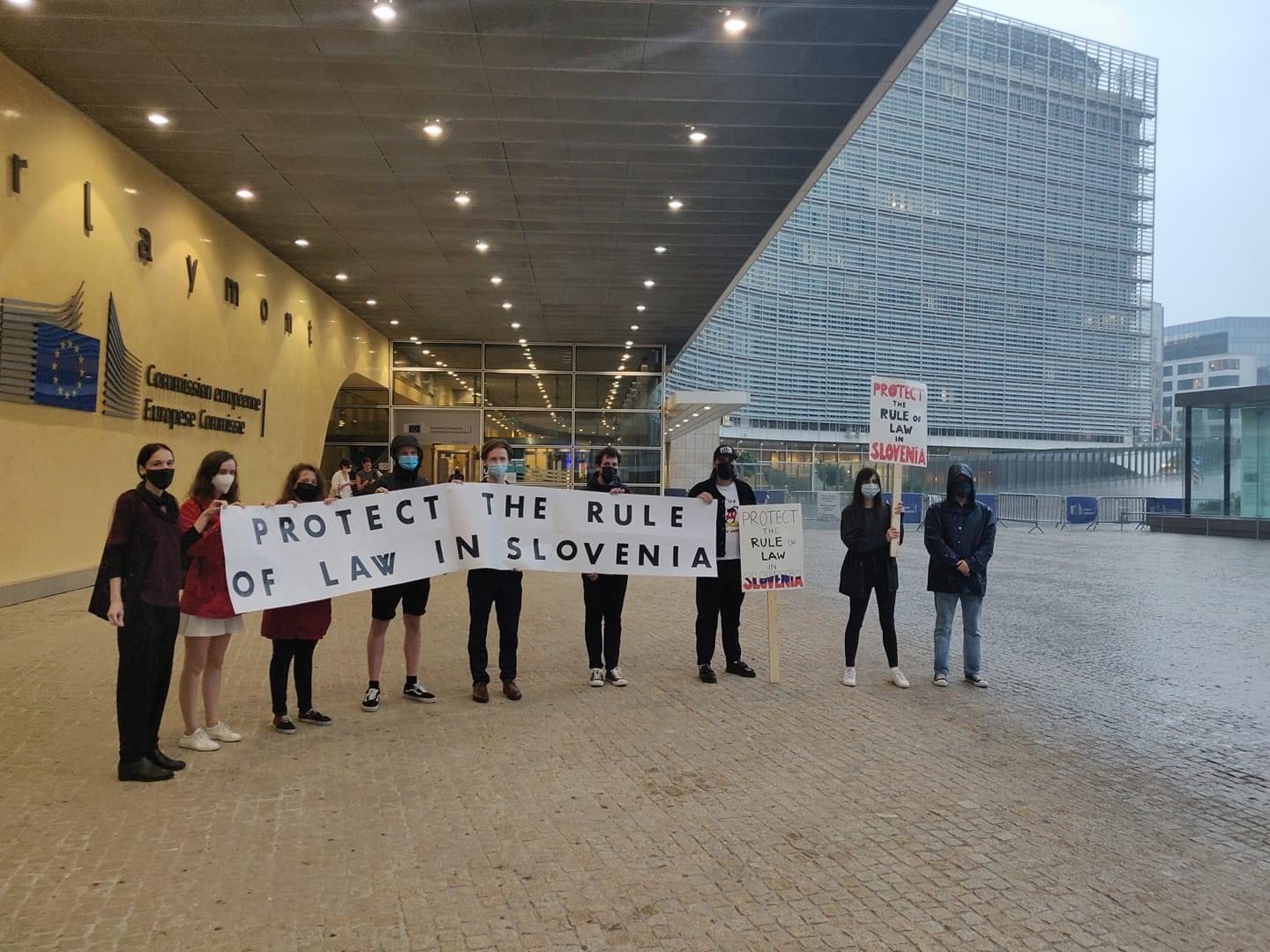 Tudi v Bruslju se je včeraj zbrala skupina okoli desetih protestnikov, ki so pred sedežem Evropske komisije Berlaymont razvili transparent s pozivom k zaščiti vladavine prava v Sloveniji v angleščini.