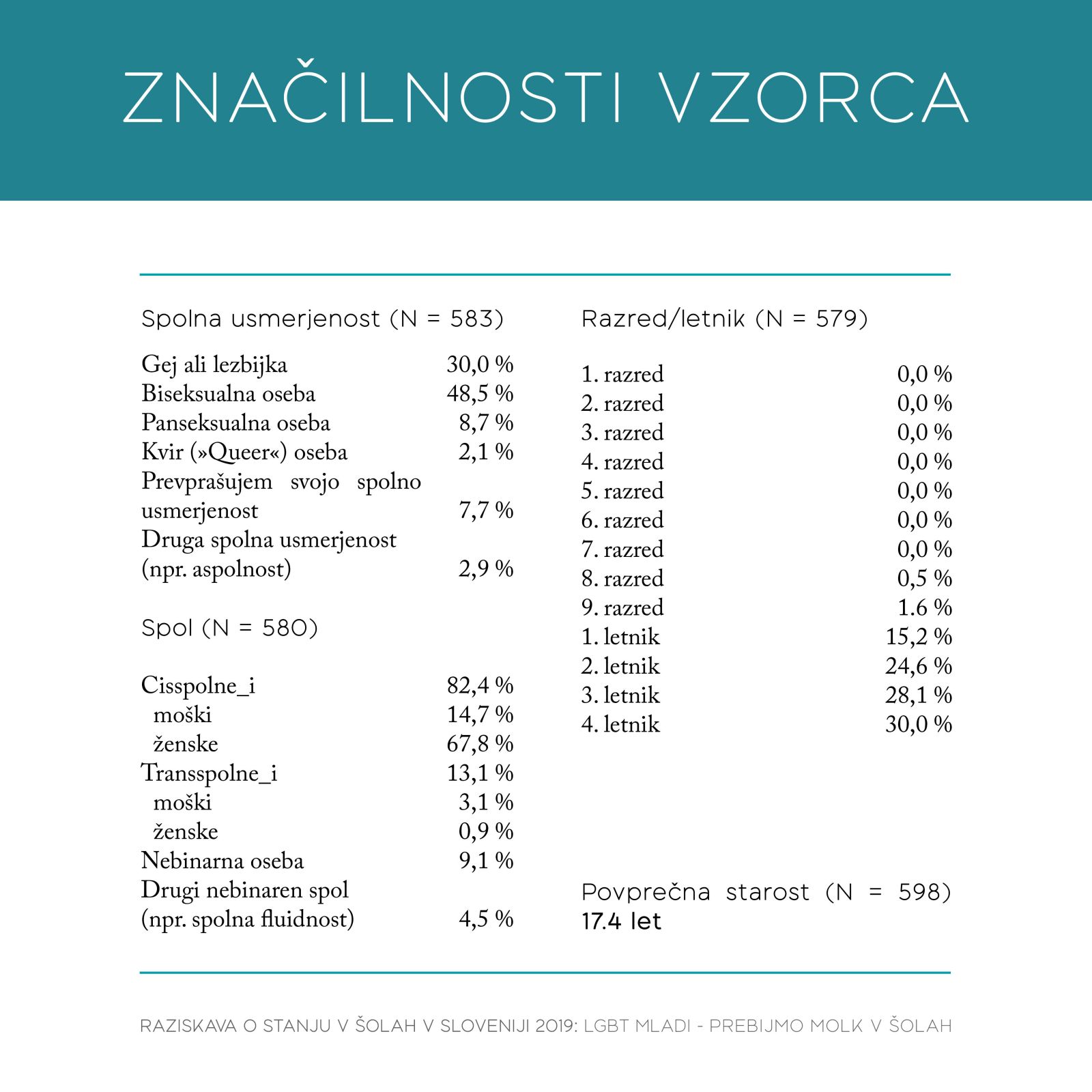 V raziskavi sta sodelovali 602 osebi, stari od 16 do 21 let. Povprečna starost sodelujočih je bila 17,4 leta. Sodelujoči so prihajali iz vseh slovenskih regij.