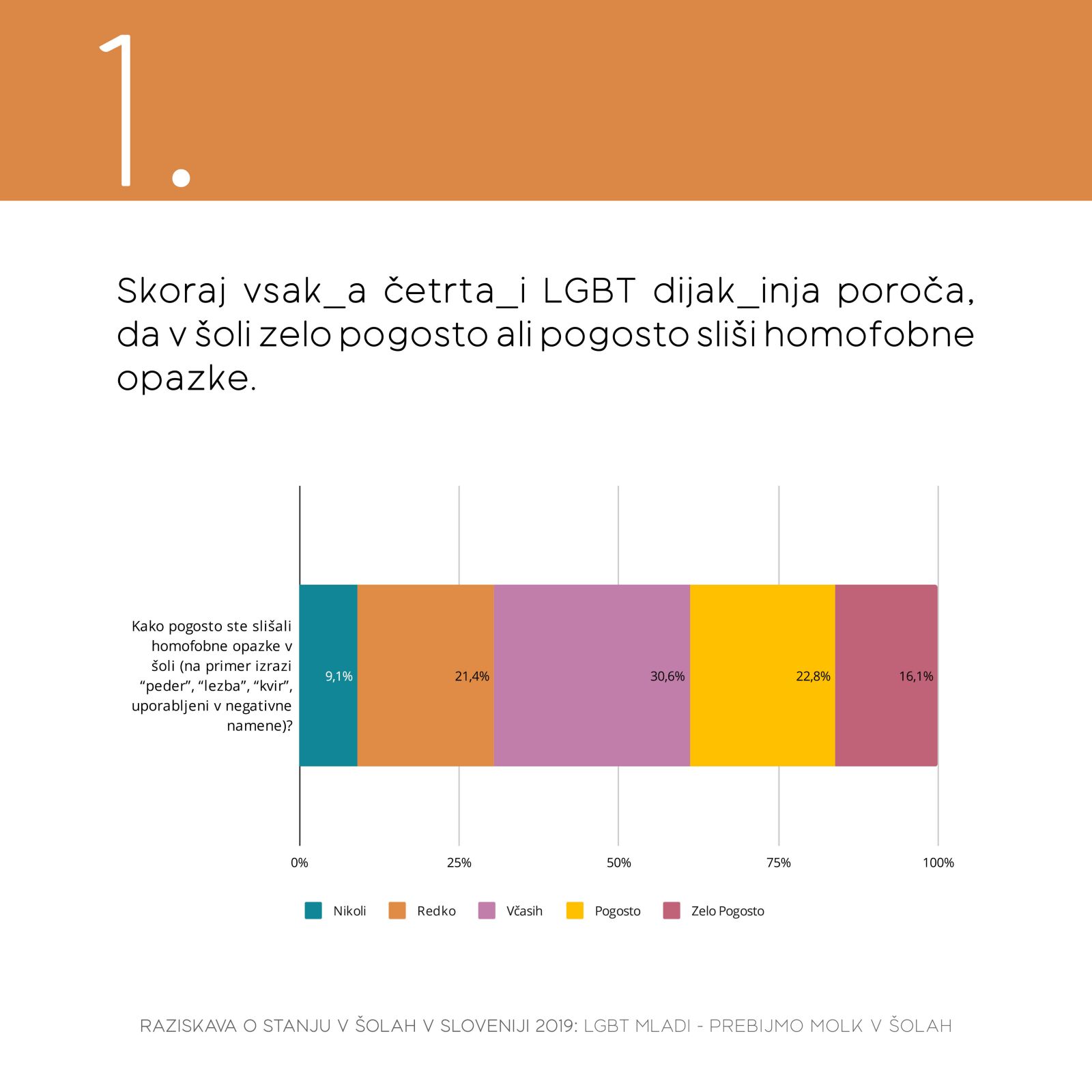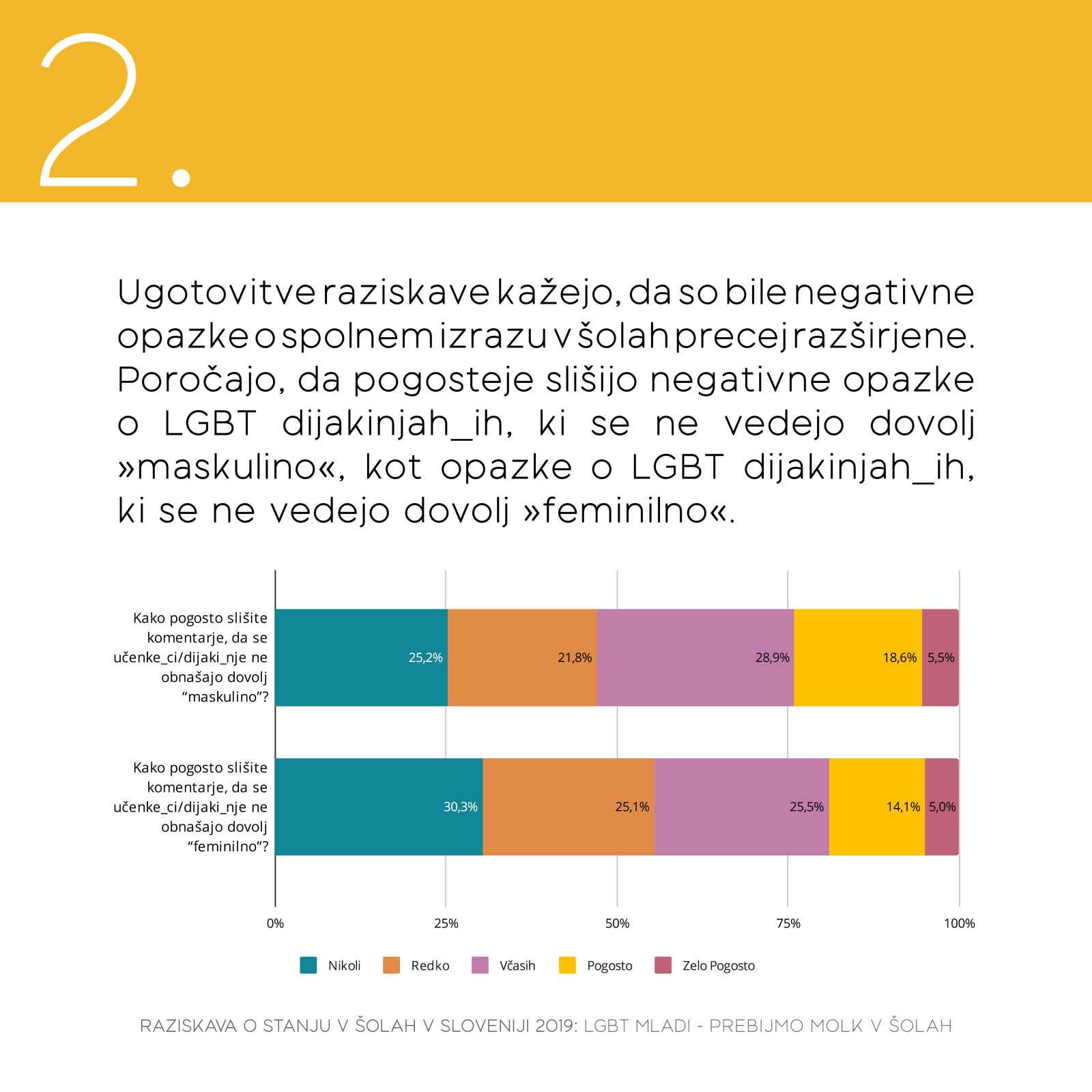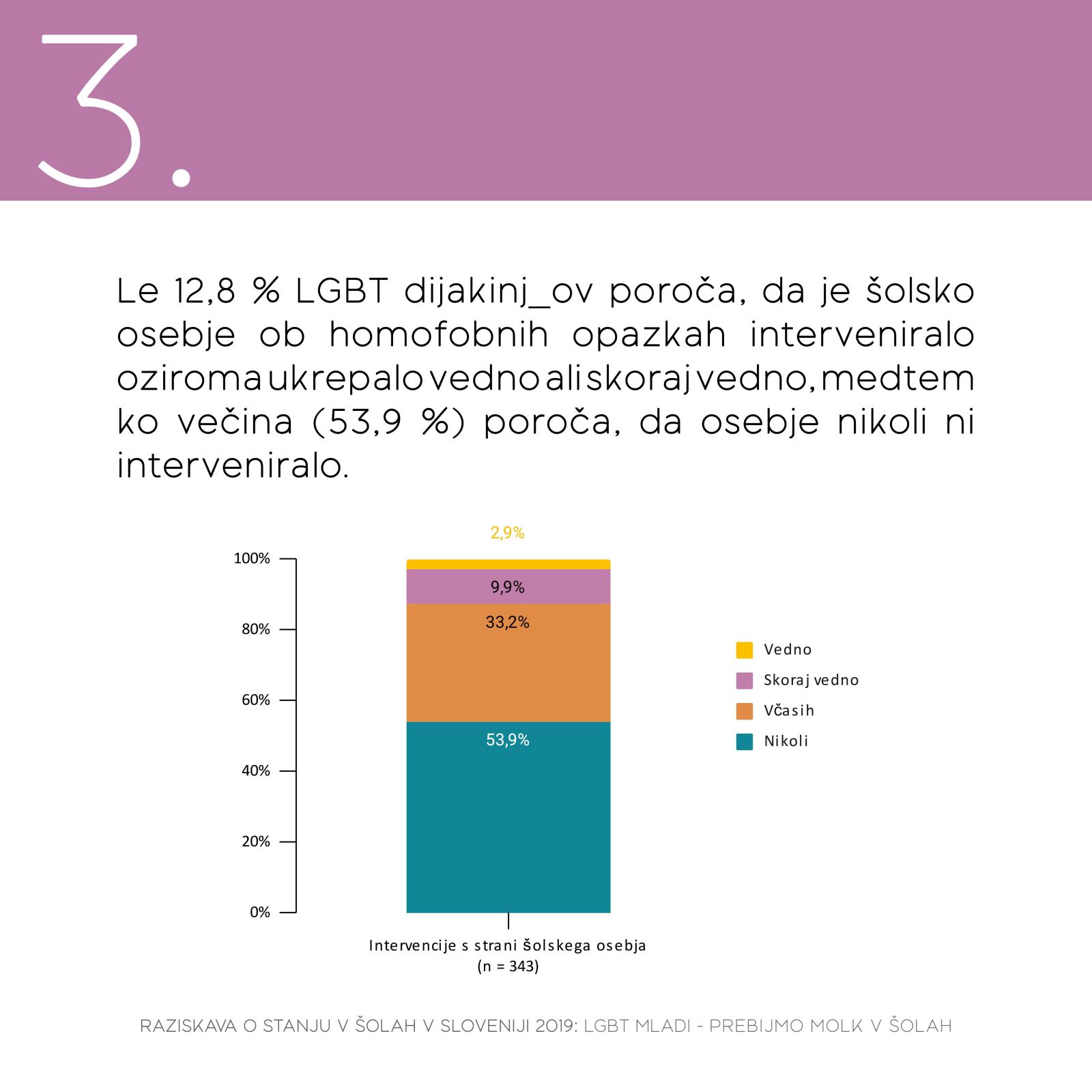 Vsak četrti sodelujoči LGBT+ dijak* poroča, da v šoli pogosto sliši homofobne opazke. Ob tem je le 12,8 odstotka sodelujočih dejalo, da je šolsko osebje ob homofobnih opazkah vedno ali skoraj vedno posredovalo, 53,9 odstotka anketiranih poroča, da šolsko osebje nikoli ni posredovalo, 33,2 odstotka dijakov pa je posredovanje šolskega osebja opazilo občasno.