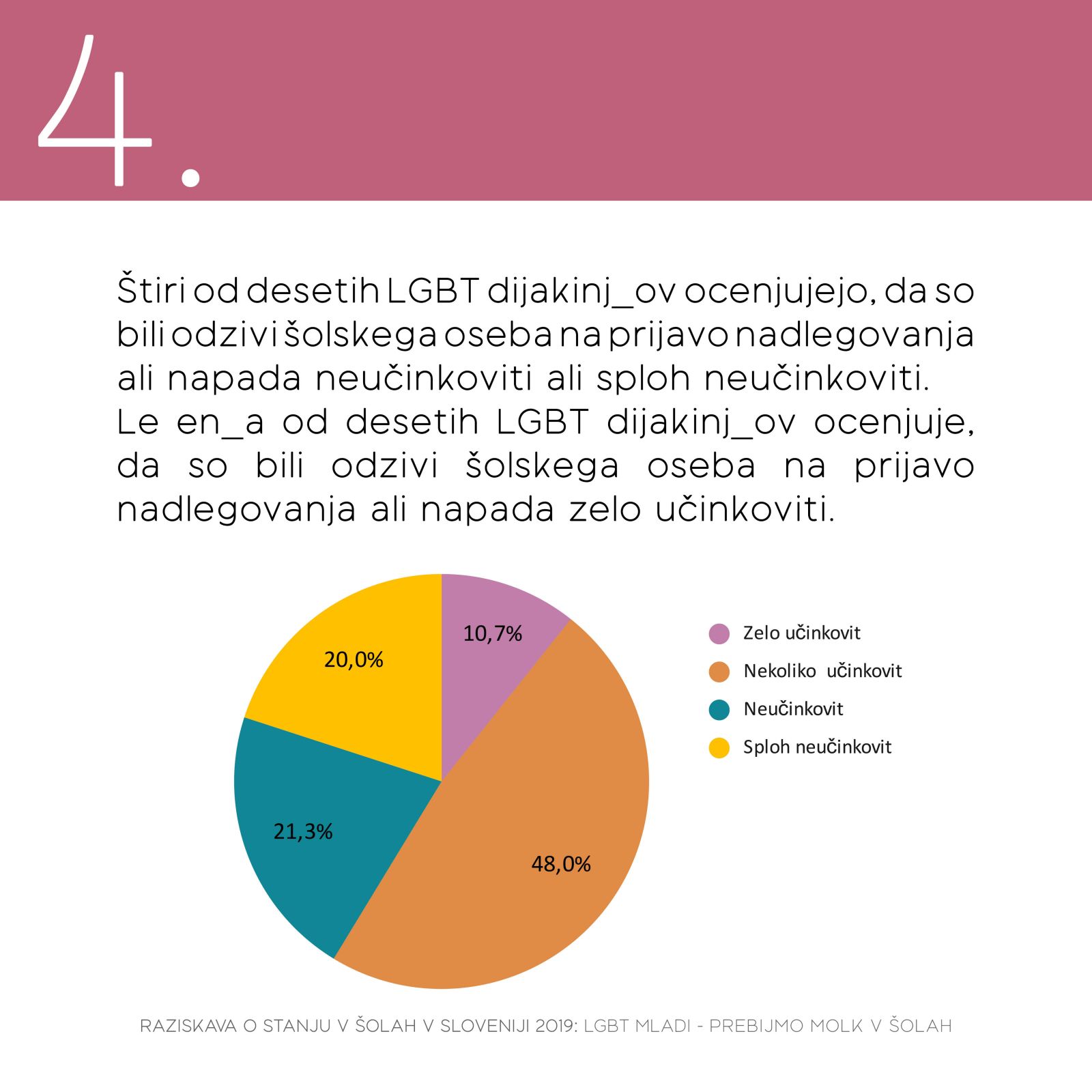 Kar 41,3 odstotka LGBT+ dijakov je ocenilo, da so bili odzivi šolskega osebja na prijavo nadlegovanja ali napada neučinkoviti. Le 10,7 odstotka dijakov ocenjuje, da so bili odzivi šolskega osebja na prijavo nadlegovanja ali napada zelo učinkoviti, 48 odstotkov dijakov pa ocenjuje, da je bilo njihovo posredovanje nekoliko učinkovito.
