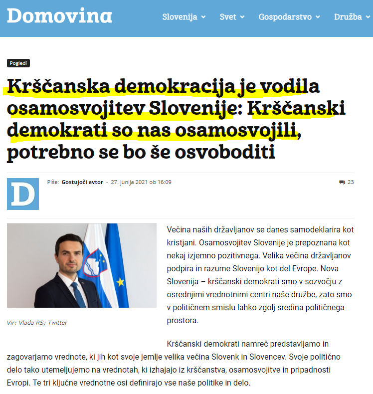 V svoji novi kolumni nam Matej Tonin na njihovi strani riše krščanske demokrate kot tisto silo, ki je nič manj kot osamosvojila Slovenijo: