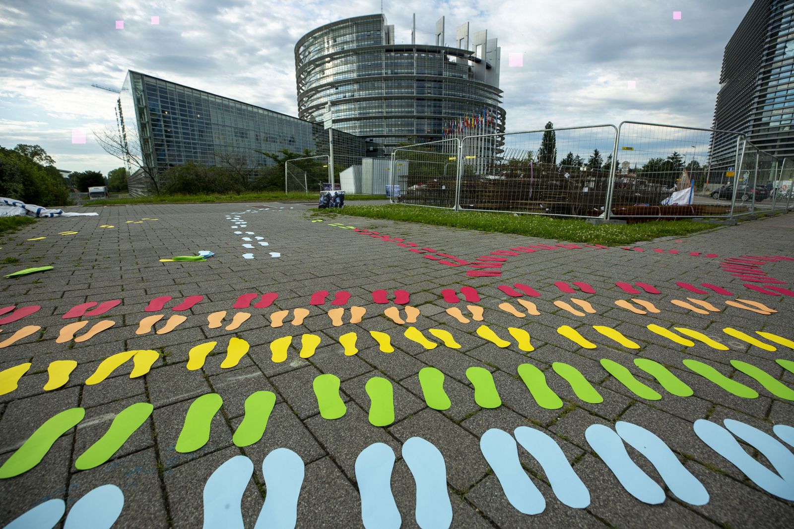 Pred Evropskim parlamentom je Janšo pričakalo 1000 stopinj v mavričnih barvah. "Te simbolizirajo petkove protestnice in protestnike, ki že več kot eno leto vztrajamo na slovenskih ulicah. Prav tako pa je bilo polaganje stopinj ena izmed prvih protestniških akcij marca 2020, kjer so posameznice in posamezniki, v času prepovedi protestov, na Trg republike individualno polagali stopinje. Zaradi tega pa so bili protiustavno oglobljeni s kaznijo v višini 400 evrov," so v Protestni ljudski skupščini zapisali v sporočilu za javnost.