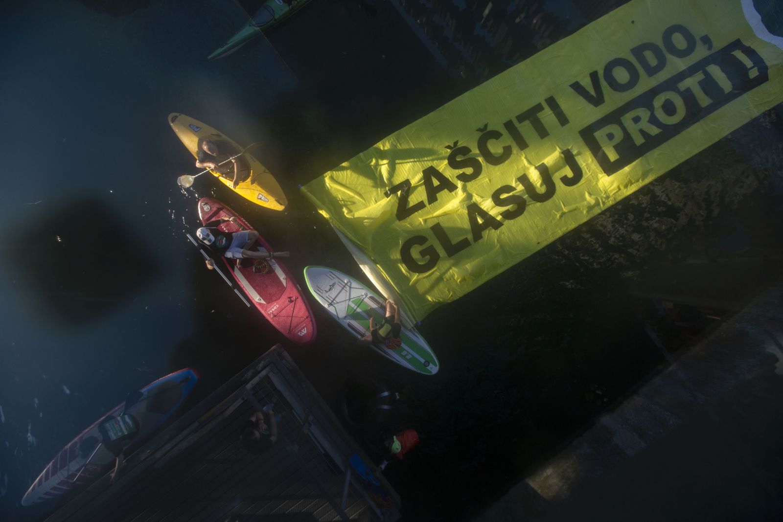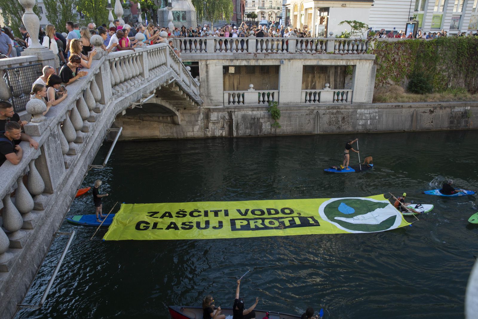 Manjša skupina protestnikov je na kanujih, kajakih in supih z vodnimi plakati protestno pot začela na Špici. Po prihodu do Tromostovja so se pridružili protestu na kopnem.