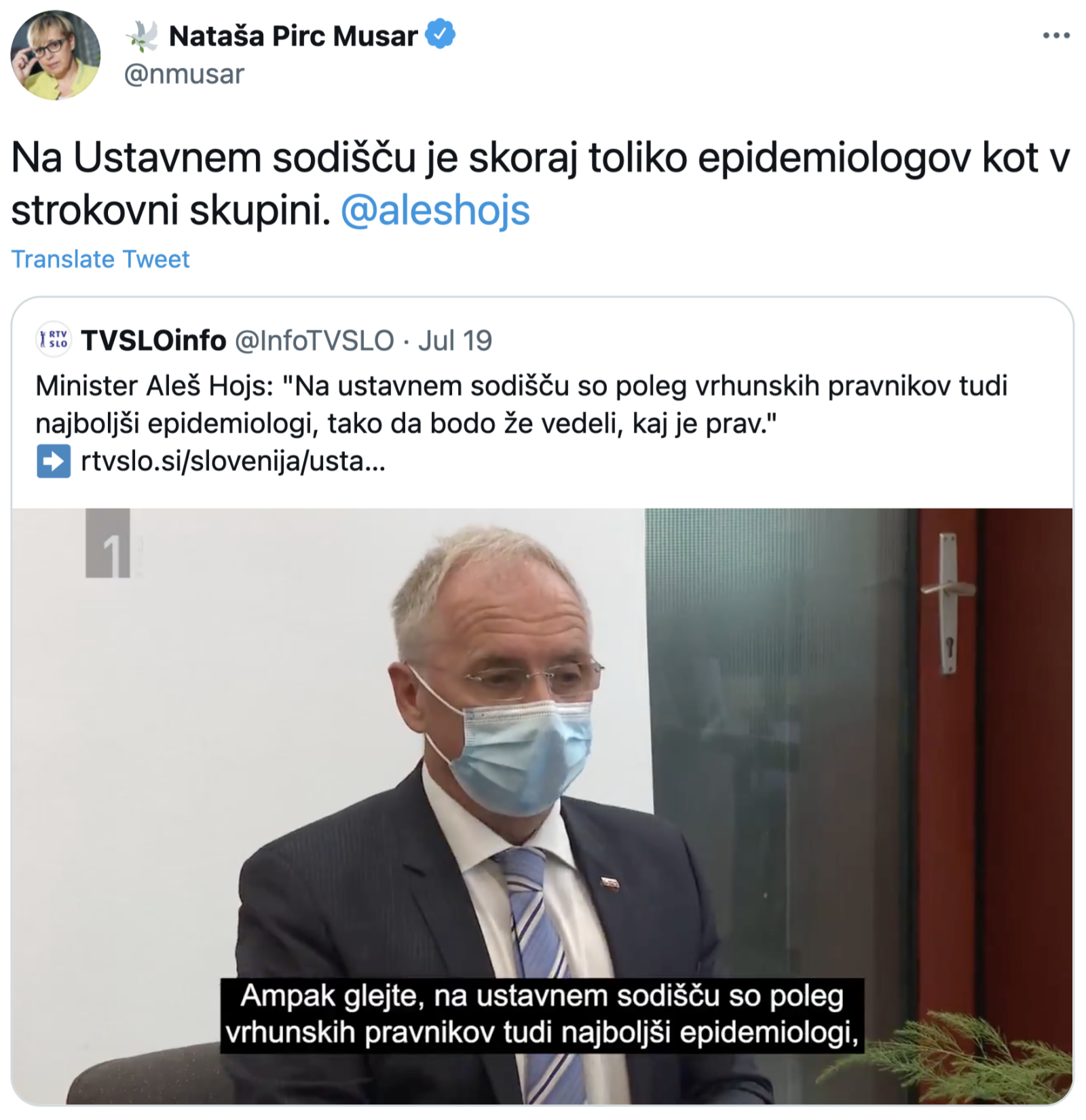 Nataša Pirc Musar, pravnica in nekdanja informacijska pooblaščenka, se je na Twitterju odzvala na izjavo notranjega ministra Aleša Hojsa. Ta je ob odločitvi ustavnega sodišča, da so bili odloki o prepovedi in omejevanju shodov neustavni, izjavil, da so na ustavnem sodišču očitno "poleg vrhunskih pravnikov tudi najboljši epidemiologi, tako da bodo že vedeli, kaj je prav." K temu je še dodal, da pač niso "vsi tako veliki strokovnjaki, kot so na ustavnem sodišču."