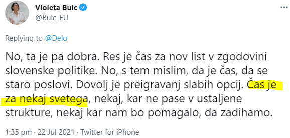 Samozavest nekdanje komisarke se je pokazala tudi pred enim tednom, ko je na tviterju nekam triumfalno, tokrat še brez omembe o svojih vpletenosti, napovedala »čas za nov list«, za ultimativno preobrazbo v domači politiki in za nič manj kot »čas za nekaj svetega«: