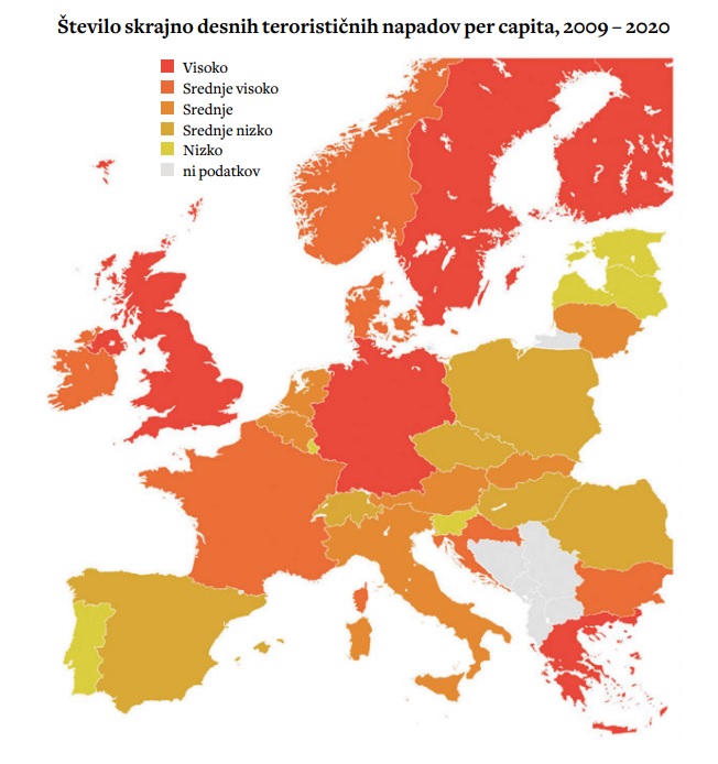 To je sicer le statistika zadnjega leta. Kaj pa prej? Ameriška nevladna organizacija CSIS je nedavno sestavila bazo 2241 terorističnih incidentov v Evropi med letoma 2009 in 2020. Sodeč po tej analizi sta bili dve tretjini vseh smrti posledica džihadističnih terorističnih napadov, okoli 20 odstotkov so jih pripisali skrajni desnici, predvsem Breivikovemu pokolu leta 2011, sedem odstotkov nacionalističnim in separatističnim napadom, le dva odstotka pa skrajno levim ekstremistom. Tudi slovenski uradni organi, kot je Sova, so imeli v zadnjih letih nemalo težav z dokazovanjem obstoja skrajno levičarskih organizacij v Sloveniji, pa naj je to od njih politika še tako zahtevala. Poročilo Sove o ekstremističnih skupinah je druga Janševa vlada leta 2012 poskušala na vsak način uravnotežiti z levim ekstremizmom, na primer z grožnjami Janezu Janši, s protiglobalističnimi protestniki in protesti proti vojni v Iraku. V SDS so v zadnjem desetletju presegli še tako bujno domišljijo. Tako so se izjemno trudili, da bi iransko pranje denarja prek NLB pripisali levičarskemu državnemu terorizmu, ki domnevno Iranu pomaga zgraditi atomsko bombo. S podobnimi nameni so leta 2010 vložili ustavno obtožbo proti tedanjemu predsedniku države Danilu Türku – očitali so mu, da je bil leta 1979 soodgovoren za (teroristični) bombni napad v Avstriji, v Velikovcu.