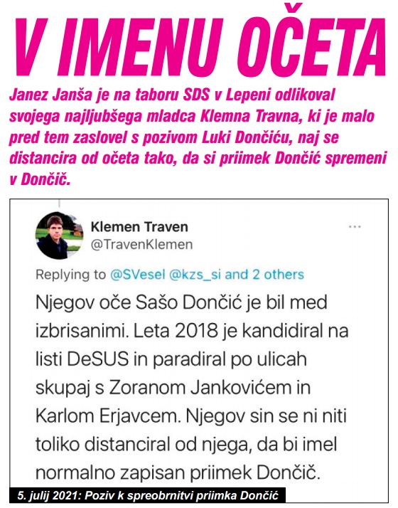 Janez Janša je na taboru SDS v Lepeni odlikoval svojega najljubšega mladca Klemna Travna, ki je malo pred tem zaslovel s pozivom Luki Dončiću, naj se distancira od očeta tako, da si priimek Dončić spremeni v Dončič.