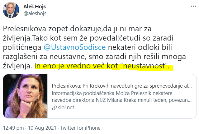 Zadnji Hojsov zgled pa je z vidika analize trikov politične retorike nekaj, kar se zdi šolsko uporabno za potrebe ilustracije: kot notranji minister je komentiral reakcijo informacijske pooblaščenke Mojce Prelesnik, ki je začela inšpekcijski postopek o NIJZ za preverjanje izpolnjevanja pogojev PCT, nato pa napovedala preverjanje ustreznosti odloka vlade skozi presojo Ustavnega sodišča. Njegov komentar pooblaščenke je zmerjaški po motivaciji in zamisli, menda kruti pooblaščenki je poočital, da ji ni mar za življenja, medtem ko jih njegova vlada kajpak rešuje: "Prelesnikova zopet dokazuje, da ji ni mar za življenja. Tako kot sem že povedal: četudi so zaradi političnega Ustavnega sodišča nekateri odloki bili razglašeni za neustavne, smo zaradi njih rešili mnoga življenja. In eno je vredno več kot »neustavnost«."