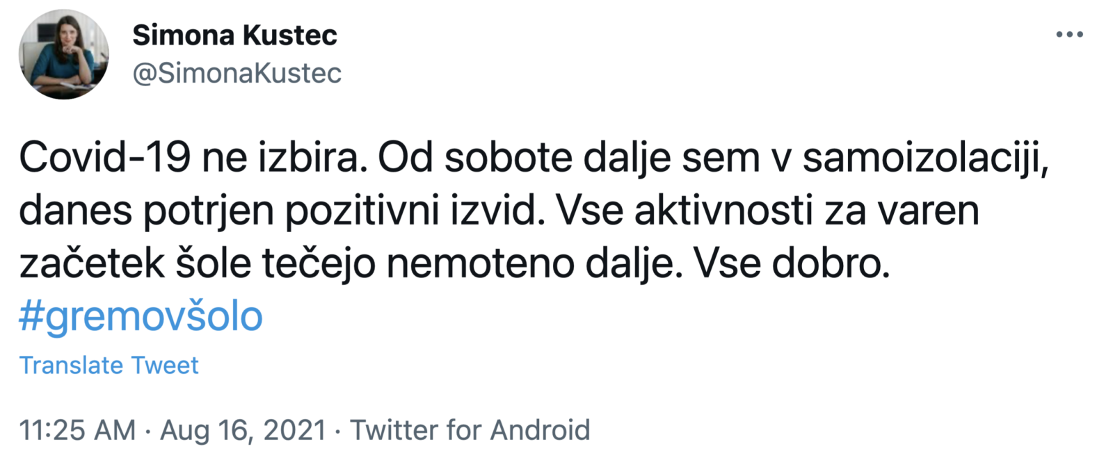Ministrica za izobraževanje Simona Kustec je prek Twitterja sporočila, da je okužena z novim koronavirusom. "Covid-19 ne izbira. Od sobote dalje sem v samoizolaciji, danes potrjen pozitivni izvid. Vse aktivnosti za varen začetek šole tečejo nemoteno dalje," je zapisala.