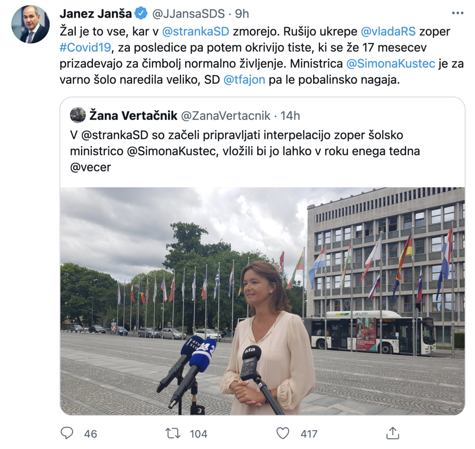 Premier Janez Janša po napovedani interpelaciji šolske ministrice Simone Kustec s strani Socialnih demokratov in opozicije na Twitterju ocenjuje, da je žal to vse, kar v SD zmorejo. "Rušijo ukrepe vlade zoper covid-19, za posledice pa okrivijo tiste, ki si že 17 mesecev prizadevajo za čimbolj normalno življenje. Kustec je za varno šolo naredila veliko, SD pa le pobalinsko nagaja," je zapisal.
