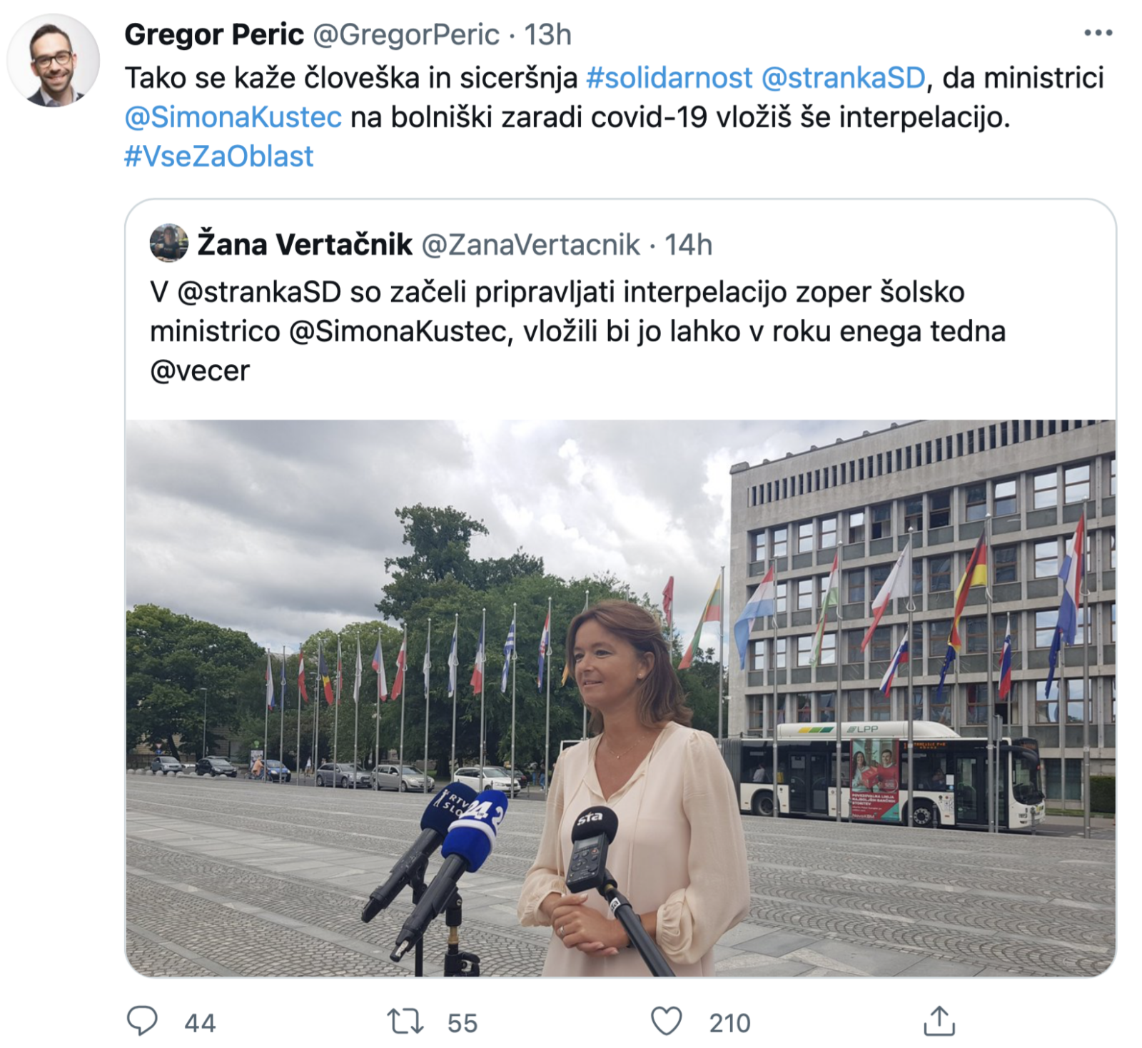 Vodja poslanske skupine SMC Gregor Perič je danes napovedano interpelacijo ministrice iz kvote njihove stranke na Twitterju pospremil s komentarjem, da se tako kaže človeška in siceršnja solidarnost SD, da ministrici na bolniški zaradi covida-19 vložiš še interpelacijo. Dodal je ključnik: "Vse za oblast".