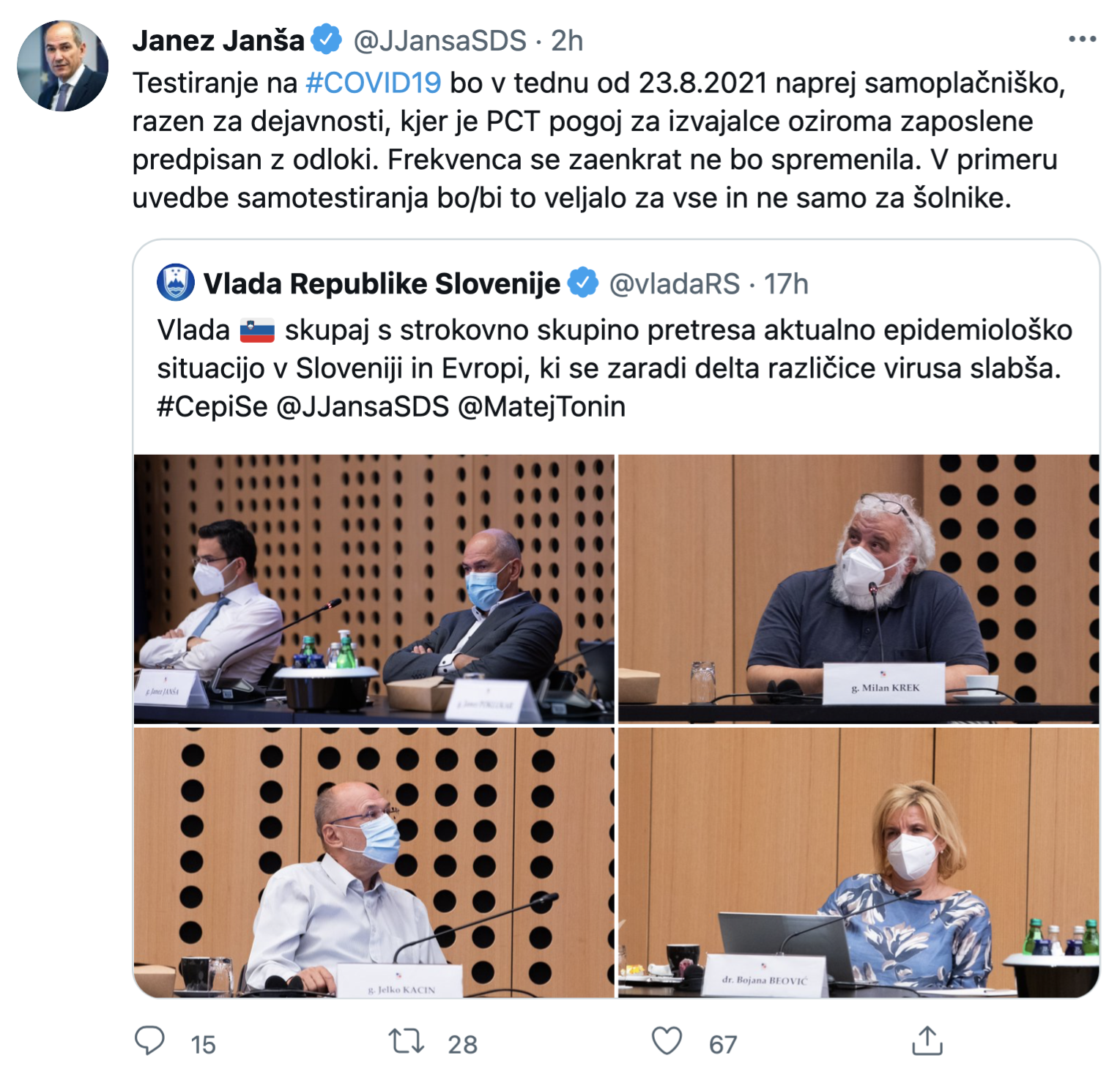Premier Janez Janša je na Twitterju naznanil, da bo testiranje na okužbo z novim koronavirusom po 23. avgustu samoplačniško, razen za dejavnosti, kjer je pogoj PCT (prebolevnik, cepljeni, testirani) za izvajalce oziroma zaposlene predpisan z odloki. V primeru uvedbe samotestiranja pa bo po njegovih napovedih to veljalo za vse, ne le za šolnike.