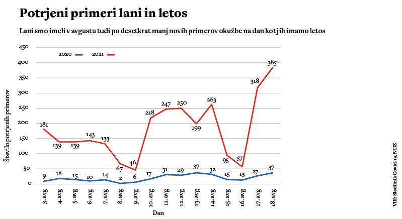 V torek, 16. avgusta 2021, je Slovenija prvič v četrtem valu že presegla 300 okuženih na dan. Prelom v visoke številke se je torej zgodil že dva meseca prej kot lani. Seveda se na prvi pogled zdi, da ni mogoče kar tako primerjati enega in drugega leta, vendar za to obstajajo utemeljeni razlogi: med počitnicami imajo ljudje drugačne medsebojne stike, šolske počitnice pomenijo drugačen način življenja in manj stikov med mlajšimi. Ponoven polni zagon gospodarstva in šolskega sistema, ki se zgodi vsako leto 1. septembra, nedvomno močno vpliva na širjenje virusa, kar priznavata in poudarjata tudi vlada in NIJZ, ki sta že sredi julija začela pozivati prebivalstvo, naj se z dopustov vrnejo do 15. avgusta.