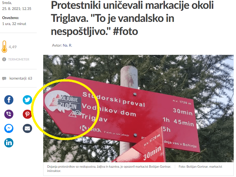 Po njegovem so petkovi protestni kolesarji svoje nalepke z logotipi nevzgojeno lepili na planinske smerne table in drogove okoli koče na Planiki. Kar pa da je prepovedano in se lahko kaznuje tudi z denarno kaznijo. Na Siolu so potem objavili natančno dve fotografiji z dokazili o »vandalskem obnašanju«: na eni sta na drog nalepljeni dve manjši nalepki, ena s prekrižano svastiko in druga s kolesarskimi logotipom.
