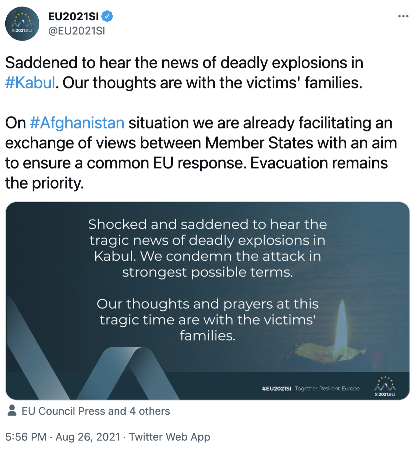 Da evakuacija ostaja prednostna naloga, je na Twitterju zapisalo tudi slovensko predsedstvo Svetu EU. Dodali so, da predsedstvo že zagotavlja izmenjavo mnenj med državami članicami EU o razmerah v Afganistanu, da bi pripravili skupen odziv EU.