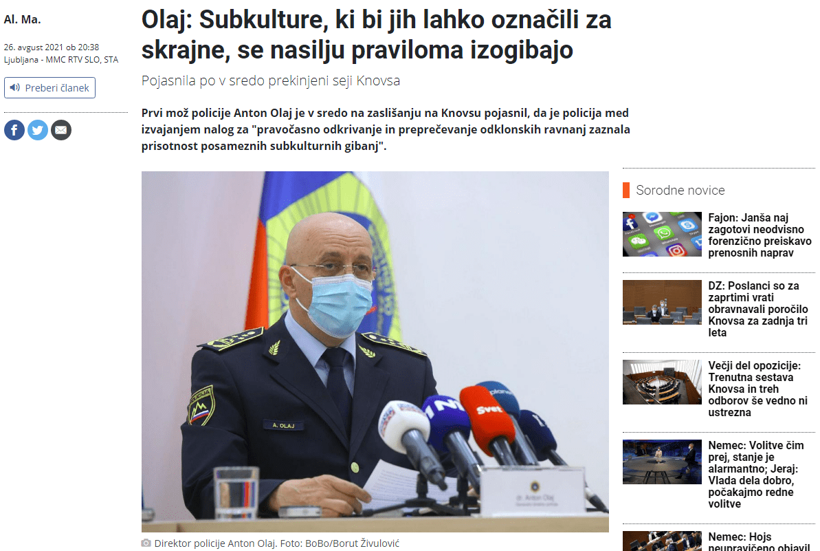 Da so »zaznali posamezna subkulturna gibanja«, je povedal generalni direktor policije dr. Anton Olaj ob priložnosti zaslišanja pred parlamentarno komisijo za nadzor obveščevalnih in varnostnih služb (Knovs), kamor sta bila povabljena tudi Janez Janša in Žan Mahnič, a sta sejo obstruirala in se iz nje in njenih sklicateljev grobo norčevala. V nadaljevanju bom poskušal utemeljiti, zakaj že dikcija direktorja razkriva politično motivirano podstat novega vodstva policije in zakaj nam pove preveč, s tem pa olajša dokazovanje, da Janševa oblast s pomočjo policije ščiti tiste skrajne desničarje z afiniteto do nacizma, ki bi jih morala ustavljati.