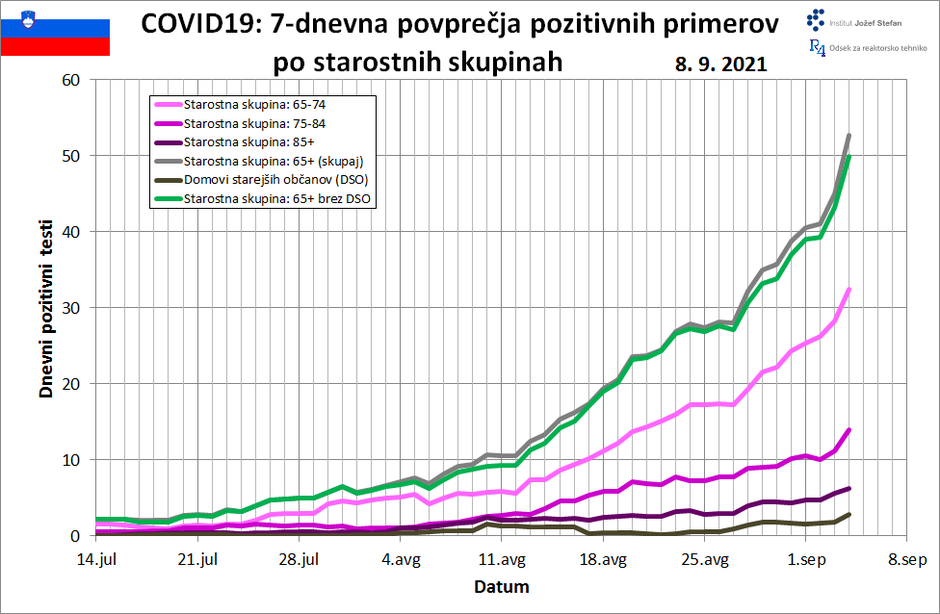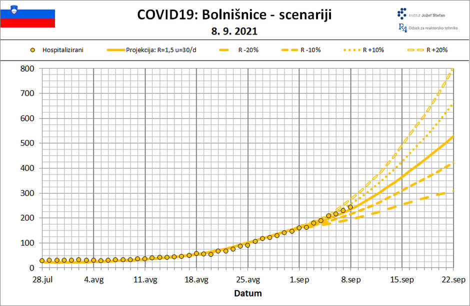Uradni vladni podatki kažejo, da epidemija covida-19 še naprej narašča s podvojitvenim časom približno 13 dni. Kot napovedujejo na Institutu Jožef Stefan (IJS), se bo podvojitveni čas v naslednjem obdobju predvidoma močno skrajšal. "Slovenija, ki je po kriterijih ECDC v rdeči fazi, pa bo v temno rdečo predvidoma prešla sredi septembra," so zapisali.
