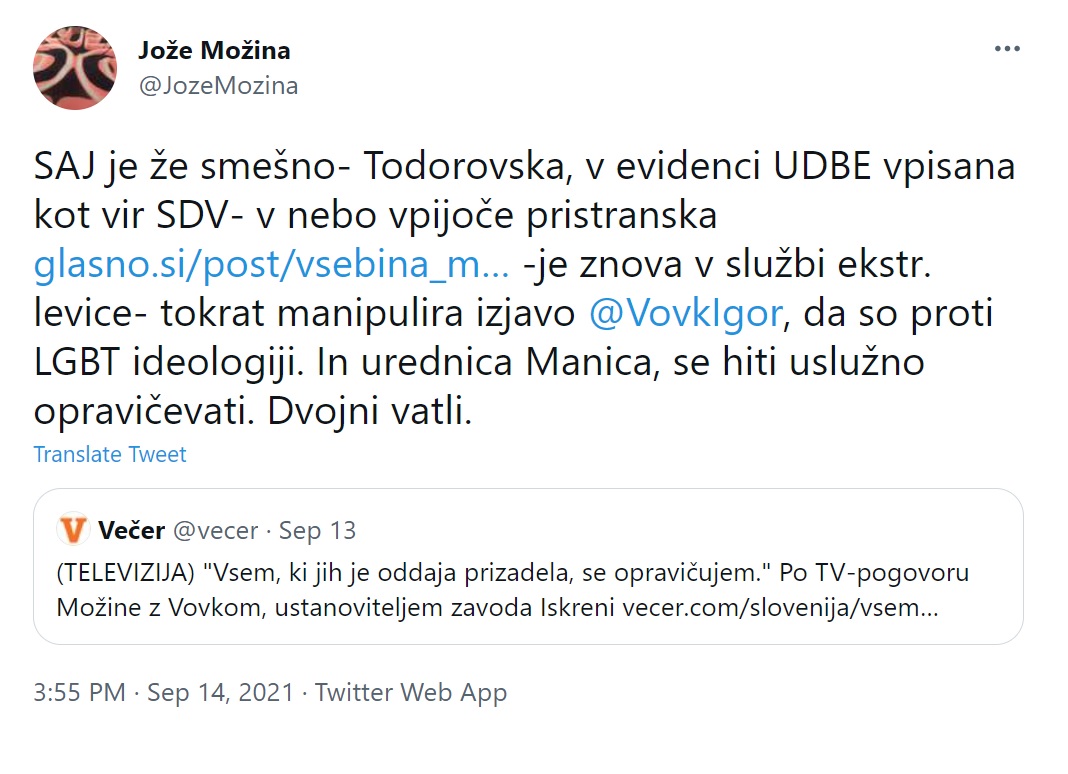 V svojem značilno ciničnem slogu pa se je oglasil Možina. Po vzoru predsednika vlade je zadevo pokomentiral kar na Twitterju in za nameček na varuhinjo in na svojo nadrejeno polil še malo gnojnice. »Saj je že smešno – Todorovska, v evidenci Udbe vpisana kot vir SDV, v nebo vpijoče pristranska, tokrat manipulira izjavo Igorja Vovka, da so proti LGBT ideologiji. In urednica Manica se hiti uslužno opravičevati. Dvojni vatli,« je tvitnil.