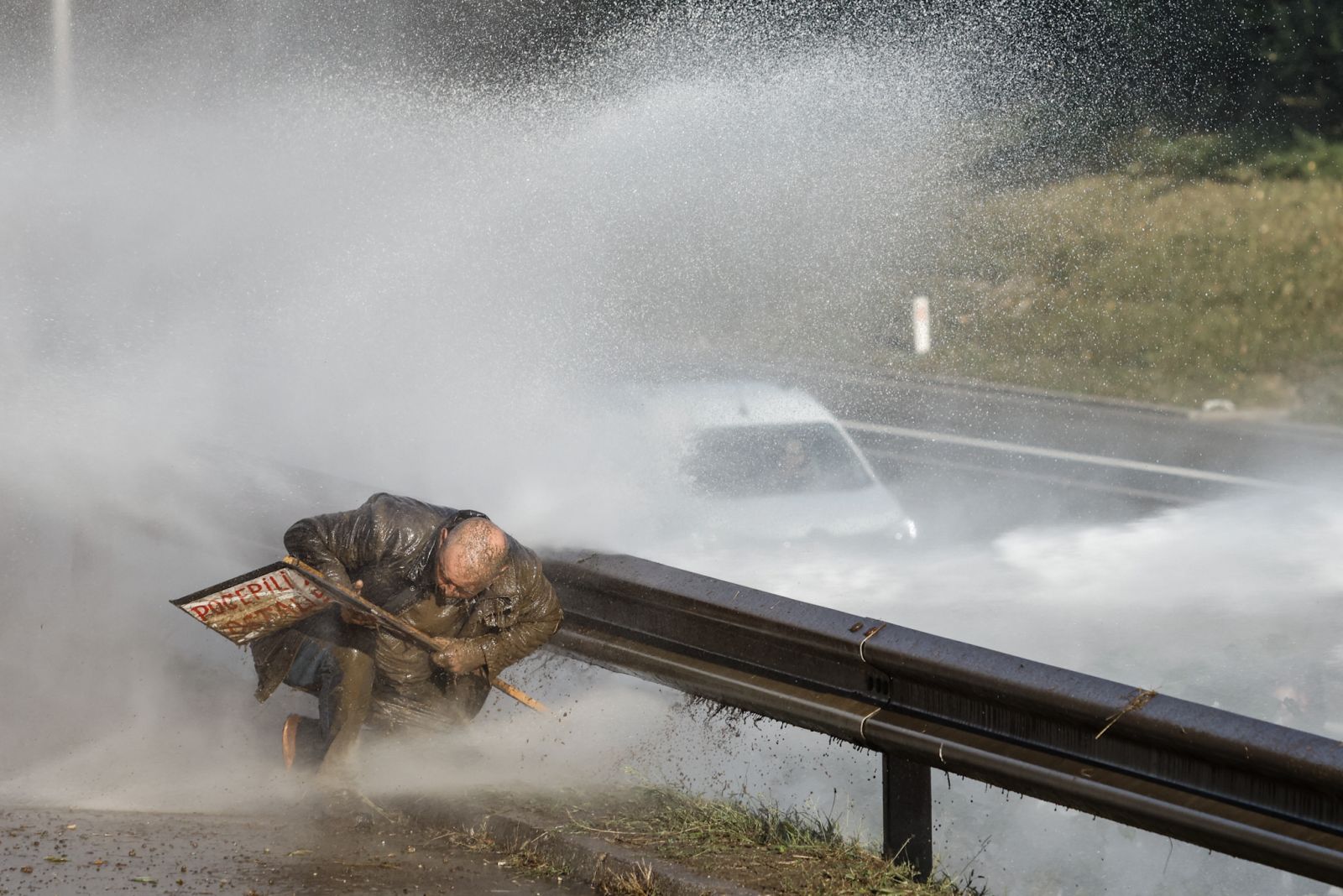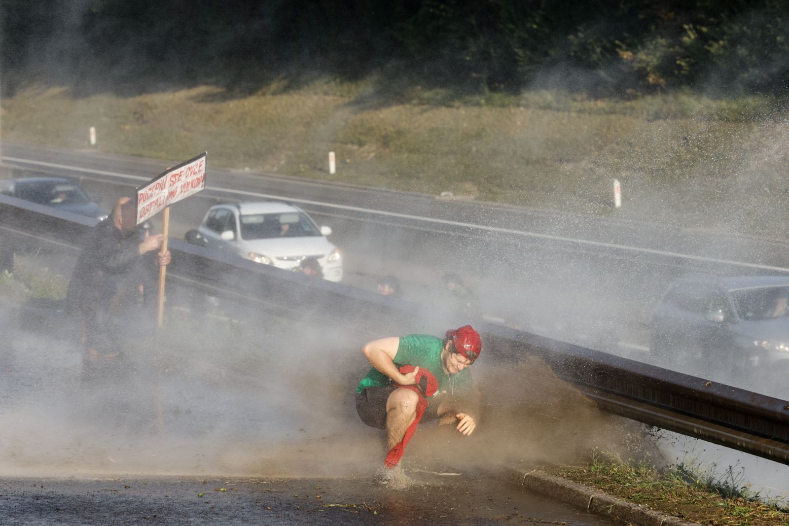 Uporaba vodnega topa nad protestnikom na ljubljanski obvoznici