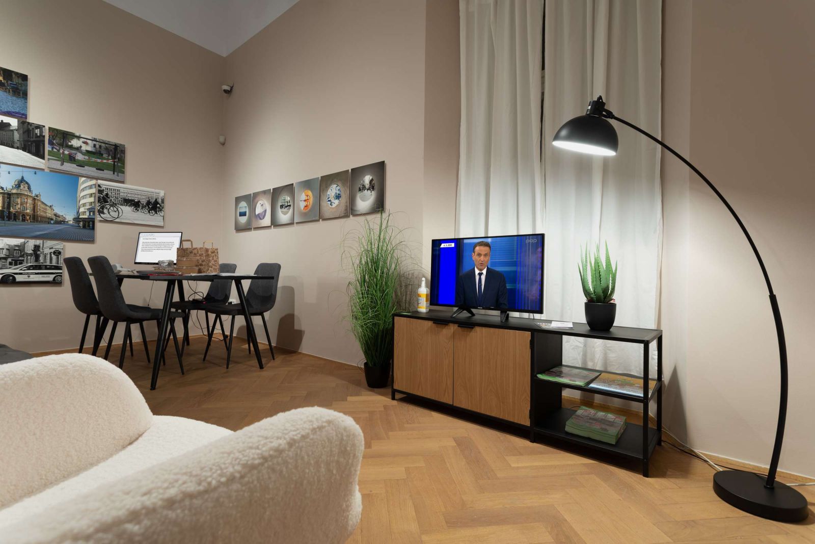 Obiskovalec nato vstopi v stanovanje, kjer smo v času zaprtja preživeli največ časa. V središču je miza z računalnikom, na katerem se prikazuje izpoved noseče samske ženske, ob njem pa so še otroški zvezek in knjiga ter vrečka dostavljavca hrane. Postavitev zaokroža dnevna soba s TV-jem, na katerem se predvajajo ključni mejniki, ki so bili državljanom podani preko dnevnih poročil. Razstavo pa zaključuje protestniški transparent, ki po besedah Kovačiča "nakazuje izhod iz muzeja naprej v življenje".