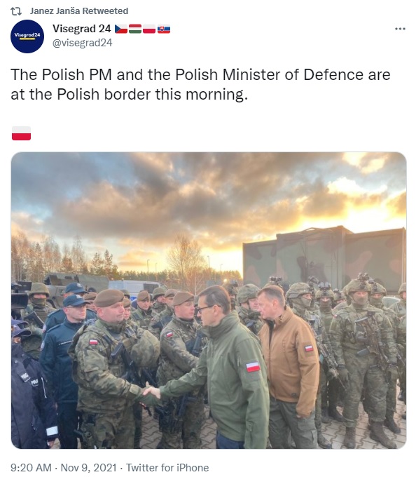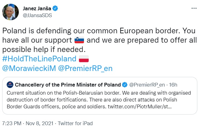 Podporo Poljski je zagotovil tudi slovenski premier Janez Janša. "Poljska brani našo skupno evropsko mejo," je tvitnil. Ob tem je zagotovil pripravljenosti Slovenije, da ponudi pomoč.