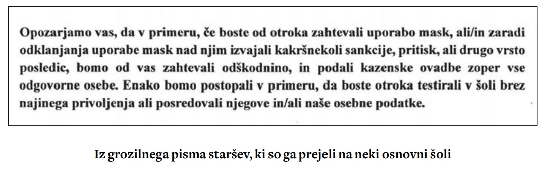 Iniciative proticepilskih staršev, kot so Sonce in Otrok ne damo, vodstvom šol pošiljajo dopise, v katerih jim grozijo s tožbami in kazenskimi ovadbami zaradi mask in samotestiranja otrok.