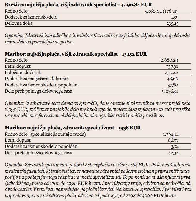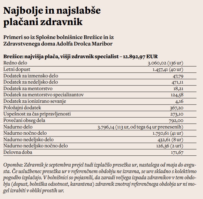 Glede na to, da imajo zdravniki že zdaj najvišje plače v javnem sektorju, se zdijo te zahteve seveda zelo neprimerne. Na drugem mestu na lestvici najvišjih plač, izplačanih v javnem sektorju za delo septembra, je recimo višji zdravnik specialist iz brežiške bolnišnice. Za delo je prejel 12.892 evrov, pri tem, da je bil septembra en teden (40 ur) na dopustu. Omenjeni zdravnik je za 136 ur rednega dela dobil 3060 evrov bruto, vse drugo so bili dodatki, ki so si jih zdravniki izborili v preteklosti. Omenjeni brežiški zdravnik je v nedeljo delal 10 ur, za kar je dobil 1030 evrov bruto, v zgolj treh tednih je opravil več kot 230 ur, če ta neverjetni podatek seveda drži. Računsko sodišče je namreč v nedavnem revizijskem poročilu opozorilo, da tako imenovanih efektivnih ur, torej ur, ko zdravniki resnično delajo, nihče posebej ne šteje. V Splošni bolnišnici Brežice smo še prosili, naj nam pošljejo podatke o plači zdravnika, ki je septembra zaslužil najmanj. Najmanj je pri njih, so nam pojasnili, zaslužil zdravnik z odločbo o invalidnosti, zaradi katere lahko dela le ob dopoldnevih. Septembra je zaslužil 4196 bruto ali okoli 2500 evrov neto.