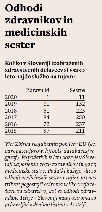 Vse to govori v prid tezi, da je izseljevanje slovenskih zdravnikov vsaj povprečno, če ne podpovprečno in da delovne razmere tukaj niso tako kritične, kot jih poskušajo prikazati v zdravniških organizacijah. Tudi sicer so podatki o zaposlovanju zdravnikov v zadnjih letih spodbudni. Po podatkih NIJZ smo leta 2011 v Sloveniji imeli 5272 zaposlenih zdravnikov, leta 2020 pa naj bi jih skupaj bilo 7076. Leta 2011 smo imeli 2,6 zdravnika na 1000 prebivalcev, lani smo jih imeli že skoraj 3,4, to pomeni, da se hitro približujemo povprečju EU, to je 3,8 zdravnika na 1000 prebivalcev. Drži pa, da je položaj medicinskih sester, ki jih je skupaj 9043, veliko bolj skrb zbujajoč. Tudi medicinske sestre si najpogosteje – v 52 odstotkih – poiščejo delo v sosednji Avstriji. A tja odhajajo neprimerno pogosteje kot zdravniki. Od leta 2015 si jih je delo v tujini našlo kar 1126 oziroma okoli 225 na leto. Pri zdravnikih torej odide odstotek zaposlenih na leto, medicinskih sester pa se preseli trikrat več. To tudi pomeni, da je bilo z vidika, ki ga poudarjajo sami zdravniki, zvišanje njihovih plač bolj upravičeno, kot bi bilo zvišanje zdravniških.