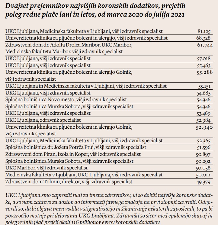 Da država do zdravnikov ni ravno mačehovska, čeprav je Kuštrin sindikalnim zaupnikom napisal, da je zvišanje plač medicinskim sestram »žalitev za vrednotenje dela zdravnikov in zobozdravnikov in dodatna klofuta zdravnikom ob vseh stiskah, s katerimi se kot odgovorni nosilci srečujemo pri obvladovanju epidemije«. O tem pričajo tudi koronski dodatki, ki jim jih je država izplačevala med epidemijo. Na ministrstvu za javno upravo so pripravili seznam stotih posameznikov, ki so med epidemijo skupaj prejeli najvišje koronske dodatke, 20 najvišjih objavljamo. Na seznamu stotih z najvišjimi koronskimi dodatki, ki se začnejo pri 81 tisoč evrih, so izključno zdravniki. Skupaj je država nekaj tisoč zdravnikom med epidemijo izplačala kar 116 milijonov evrov dodatkov – tega ni storila nobena druga država. Zdravniki v Nemčiji ali Avstriji za svoje delo med epidemijo niso dobili dodatnih nagrad, v Nemčiji so recimo lani in letos izplačali koronsko premijo v višini 1500 evrov zgolj negovalnemu osebju.