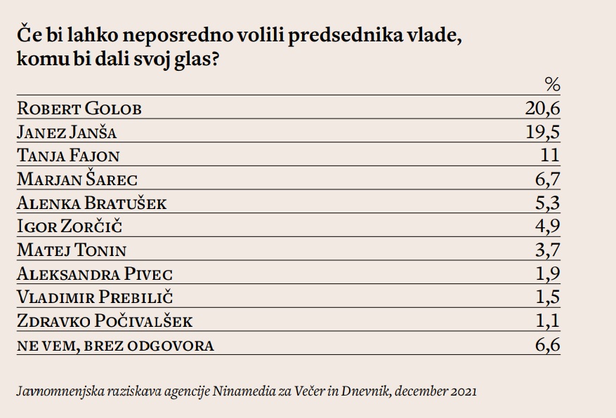 Čeprav so presenečenja seveda še vedno mogoča, je zdaj že približno jasno, s kakšno ponudbo se bodo volivci srečali na volitvah. Na eni bodo stranke, ki zavračajo skrajni populizem, na drugi pa stranke, ki so s SDS pripravljene sodelovati. Štiri stranke koalicije KUL so se do tega že jasno opredelile, vendar pa za zdaj kaže, da imajo omejen domet med volivci (dejansko enakega kot pred volitvami leta 2018). Čeprav za zdaj kaže, da bi lahko osvojile tudi večino vseh glasov, še niti ena ni tako močna, da bi se lahko pomerila za dejansko zmago nad SDS; vse so prešibke, prešibki so tudi njihovi voditelji. Zlasti v tem so šibke, noben voditelj ni javnomnenjsko zares močan. To izkazujejo tudi meritve Ninamedie za Večer in Dnevnik: na vprašanje, koga bi neposredno volili za predsednika vlade izmed danes znanih potencialnih imen, najvišje pride Tanja Fajon, ki bi jo na tem mestu podprlo 11 odstotkov volivcev, Marjan Šarec pa zbere le še 6,6 odstotka podpore. Janšo bi na primer kot ponovnega premiera podprlo 19,5 odstotka vprašanih. Potem ko je postalo jasno, da Aleksander Čeferin ne namerava prestopiti v slovensko politiko, kljub preigravanju različnih imen ni bilo nikogar, ki bi dejansko lahko ogrozil Janševo prvo mesto. Do Roberta Goloba. Slednji se je že v prvi tovrstni javnomnenjski raziskavi zavihtel na prvo mesto z 20,6 odstotka in prehitel Janšo. Razlika je minimalna, res pa Golob sploh še ni predstavil ne koncepta niti ni nagovoril volivcev.