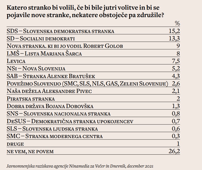 Ninamedia je pred desetimi dnevi naredila prvo javnomnenjsko raziskavo, v katero je vključila nove politične iniciative: novo predvolilno koalicijo Povežimo Slovenijo, katere del je SMC-Konkretno, novo stranko Naša dežela Aleksandre Pivec, ki je morala politiko zapustiti zaradi zlorabe javnega denarja, in seveda stranko brez imena, ki naj bi jo ustanovil Robert Golob. Če sta po meritvi Ninamedie Povežimo se in Naša dežela ostali pod pragom vstopa v državni zbor, pa se je morebitna Golobova stranka nemudoma zavihtela na tretje mesto med vsemi, takoj za SDS in SD. »Kot kažejo križanja, Golob pobira predvsem volivce iz bazena nekdanje SMC, DeSUS, LMŠ, delno pa tudi pri skoraj vseh drugih strankah, na primer tudi NSi, le volivce SDS pušča hladne,« pravi Damjanić. A kot smo zapisali: Golob je hkrati edini, ki »posega po zvezdah«, ki torej v medosebnih primerjavah mandatarskih kompetenc seže tudi čez Janeza Janšo, dosega pa tudi polovično podporo, ki v raziskavah beleži ime Aleksandra Čeferina.