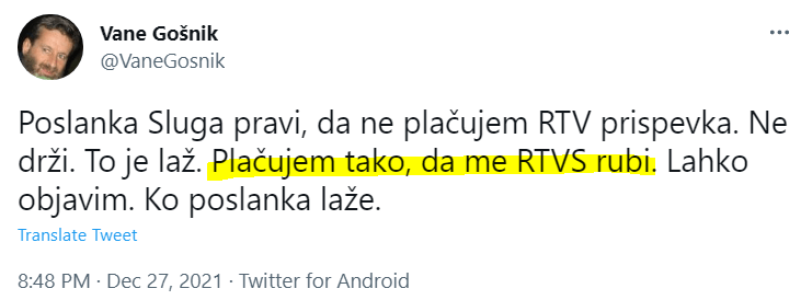 Gošnikovo pojasnilo je ikonična ilustracija retoričnega varanja, tako značilnega za zlagane avtoritarne čase, ki jih živimo. Prezirljivci javnega servisa, ki se izogibajo zakonskim obveznostim in so protizakonito kot vojščaki nastavljeni, da bi ga vodili in usmerjali, zmorejo zgolj vreščanje na račun drugih: ti da so lažnivci, ne oni. Saj vendar plačujejo RTV prispevek, in to skozi rubež! Kakor da ta ne bi bil prav posledica neplačevanja! Malokje in malokdaj najdemo na tako zgoščenem mestu v obliki kratke izjave čisto vse: derivat duha avtoritarne ošabnosti, objestnost nekoga, ki ve, da je protizakonito imenovan na položaj, a ga to prav nič ne moti, za nameček pa še moralni bankrot hvalisavca, ki neprostovoljni rubež svetohlinsko prikazuje kot obliko rednega plačevanja RTV, zato lahko druge, ki mu očitajo nasprotno, mimogrede obtoži laganja!