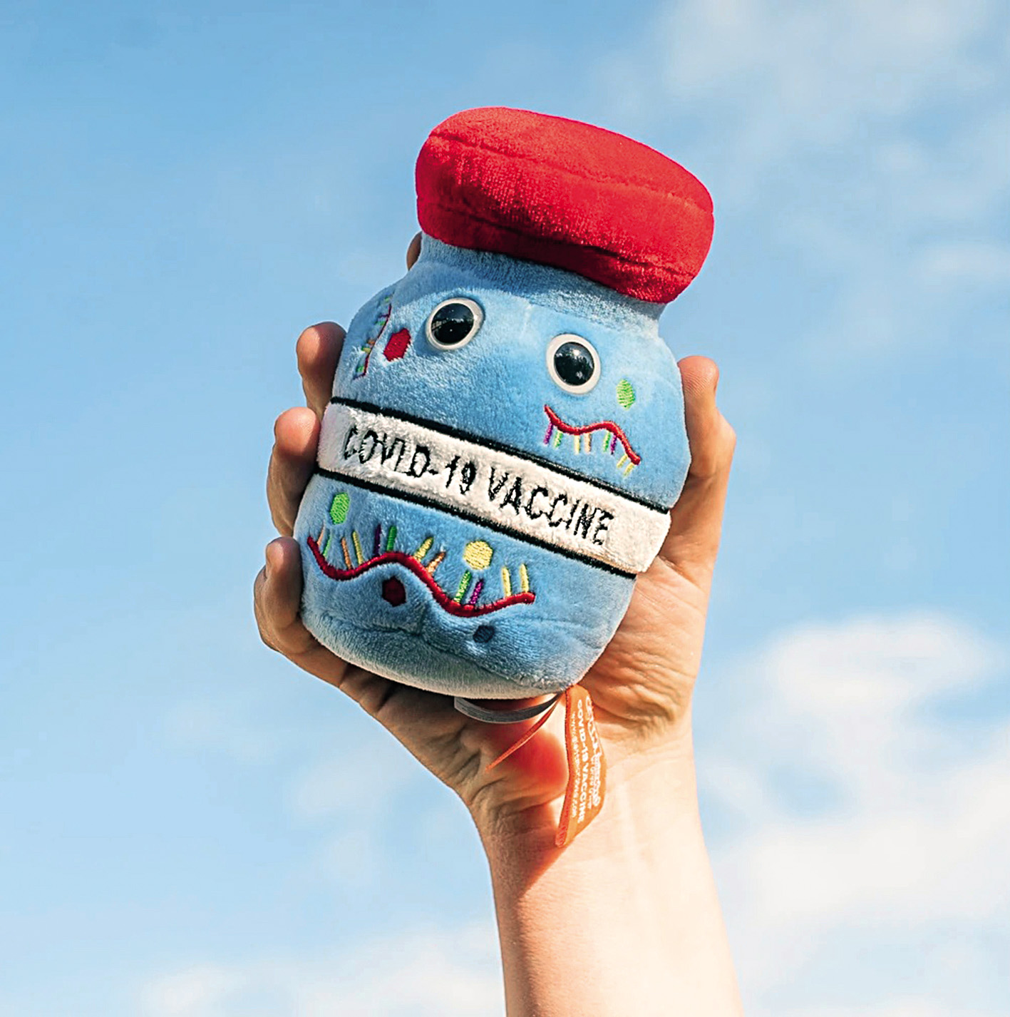 Ne glede na to, kaj si mislite o cepivih, plišasta steklenička s cepivom proti covid19 z velikimi očmi, modro vsebino in rdečim pokrovčkom se vam bo verjetno zdela ljubka in zabavna. Plišasto cepivo je brez negativnih stranskih učinkov ter stoodstotno učinkovito proti plišasti različici virusa, ki povzroča bolezen covid-19, to je SARS-CoV-2, splošno znan kot koronavirus. Oba pliškota izdeluje severnoameriško podjetje z igračami Giantmicrobes, ki prav letos praznuje dvajsetletnico in ima v svoji zbirki že več kot 250 plišastih mikrobov, organov, celic ter ostalih reči, ki jih povezujemo z zdravjem. Oba sta na voljo v veliki nekaj desetcentimetrski verziji, majhni osemcentimetrski verziji, pa tudi kot plišasta obeska za ključe ali okraska za novoletno jelko. Če imate covid-19 že poln kufer, boste morda raje izbrali plišasto cepivo proti gripi v zeleni barvi. Odslej lahko vsako cepljenje praznujete z nakupom mehkega spominka, ga podarite medicinskemu osebju ali komu od anticepilcev in cepivoskeptikov. Pliško cepivko ni primeren za mlajše od treh let, lahko pa je igračka za psa. Izdelujejo ga, kakopak, na Kitajskem.