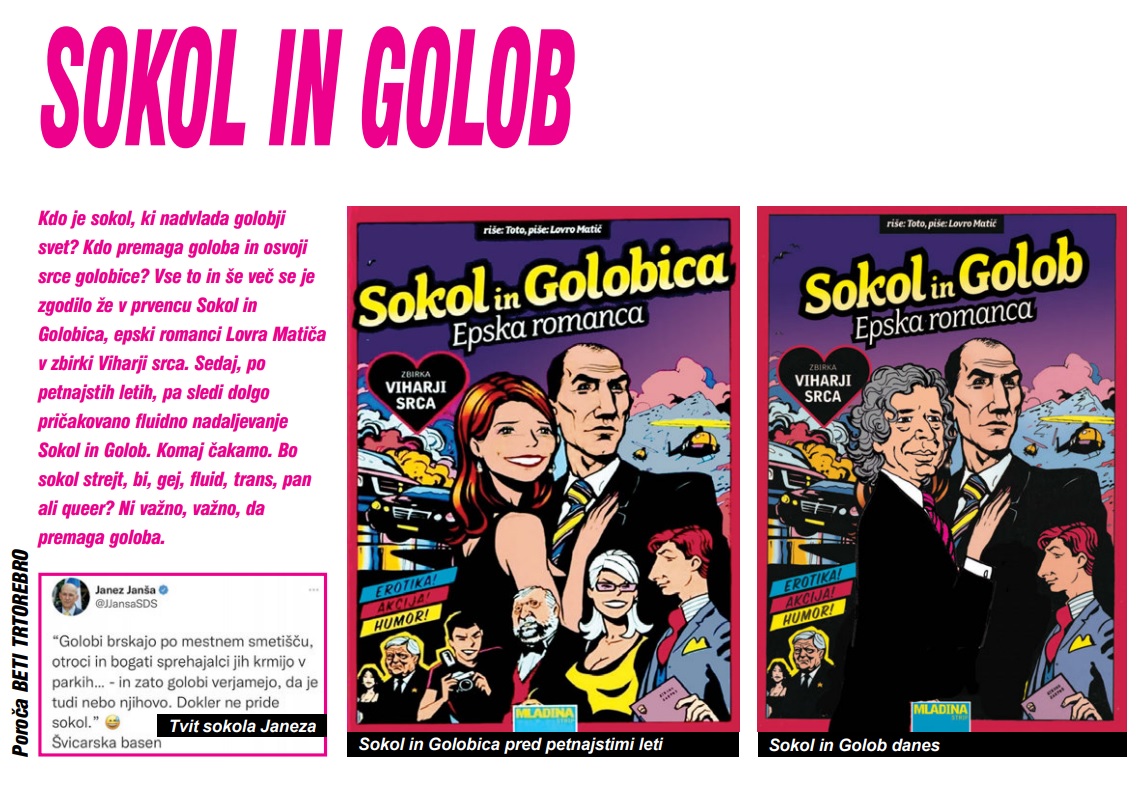 Kdo je sokol, ki nadvlada golobji svet? Kdo premaga goloba in osvoji srce golobice? Vse to in še več se je zgodilo že v prvencu Sokol in Golobica, epski romanci Lovra Matiča v zbirki Viharji srca. Sedaj, po petnajstih letih, pa sledi dolgo pričakovano fluidno nadaljevanje Sokol in Golob. Komaj čakamo. Bo sokol strejt, bi, gej, fluid, trans, pan ali queer? Ni važno, važno, da premaga goloba.