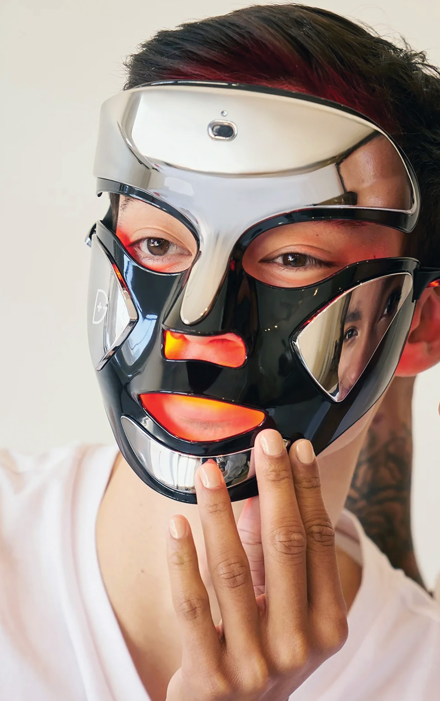 Obstaja maska, ki ni pustna, a boste z njo gotovo vsaj malo prestrašili svoje otroke, partnerje, ljubljenčke ali druge sostanovalce, ker je grozljiva, pa čeprav je namenjena temu, da postane del večernega lepotnega rituala. Navzven je videti kot sodobna, tehnološka beneška maska, v bakreno-beli ali srebrno-črni različici, navznoter pa je vanjo vgrajenih sto rdečih in dvainšestdeset modrih lučk LED, ki s svojo svetlobo delujejo proti gubam, aknam ter pigmentacijam na koži. Strašilna lepotilna maska ima tri nastavitve: njena rdeča svetloba gladi gube, modra zdravi akne, možna pa je tudi sočasna kombinacija obeh, za dvojni učinek. Maska za pomlajevanje se polni prek USB-priključka, izmislil pa si jo je dr. Dennis Gross, dermatolog iz New Yorka. Imenuje se SpectraLite FaceWare Pro in stane slabih petsto evrov. Na obraz jo pritrdimo s pomočjo nastavljivega silikonskega traku, ki objame zadnji del glave. Treba jo je nositi samo tri minute vsak dan; ker ima odprtine za oči, nos in usta, lahko med čakanjem na bolj čvrsto kožo v njej tudi kaj počnemo, na primer govorimo po telefonu, gledamo televizijo ali kadimo na balkonu.