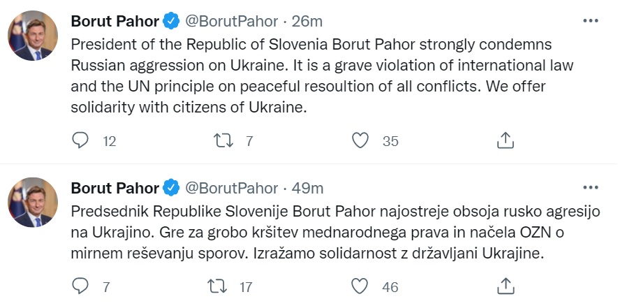 Predsednik republike Borut Pahor se je danes odzval na ruski napad na Ukrajino in ga najostreje obsodil. "Gre za grobo kršitev mednarodnega prava in načela Združenih narodov o mirnem reševanju sporov," je predsednik republike zapisal na Twitterju in hkrati izrazil solidarnost z državljani Ukrajine.