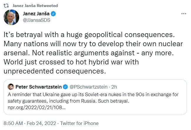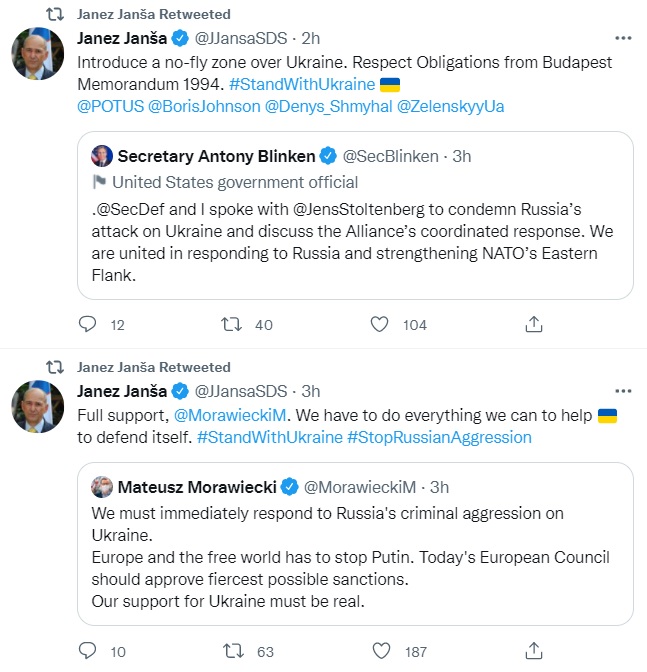 "Skupaj s svojimi zaveznicami v zvezi Nato in Evropski uniji ostro obsojamo rusko vojaško agresijo proti Ukrajini brez primere," je danes tvitnil premier Janez Janša. "Rusija mora takoj umakniti svojo vojsko in v celoti spoštovati ozemeljsko celovitost Ukrajine," kjer pa je treba vzpostaviti območje prepovedi preletov, je zapisal v angleščini.