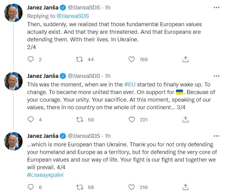 Janša je na Twitterju še opozoril, da so razprave o evropskih vrednotah v zadnjih letih večinoma potekale na teoretični ravni, sedaj pa obstaja zavedanje, da te vrednote obstajajo in da so ogrožene. "In vsi Evropejci jih branijo. S svojimi življenji. V Ukrajini," je dodal.