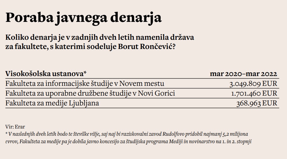 In takšnega človeka je oblast nagradila. Desetega februarja je Rončevićeva zasebna Fakulteta za medije dobila javne koncesije za izvajanje visokošolskega in magistrskega programa Mediji in novinarstvo. Gre za 40 rednih mest za brezplačni študij. Zgolj za primerjavo: na veliki ljubljanski Fakulteti za družbene vede je letos razpisanih le 35 mest za študij novinarstva, novinarstvo pa se lahko študira tudi na fakultetah v Kopru in Mariboru. Zasebna fakulteta za medije domuje na ljubljanski Leskoškovi ulici, sredi poslovne cone, večina, če ne kar vsi njeni predavatelji, pa so brez resnih strokovnih referenc s področja medijskih znanosti. Še največ o novinarstvu ve ravno Rončević, ki je soavtor več raziskav o uravnoteženosti slovenske medijske krajine, narejenih za potrebe desnih vlad. Zadnja takšna je v Rončevićevem soavtorstvu nastala lani, ministrstvo za kulturo pa je zanjo namenilo 24.000 evrov. Rezultat raziskave je bil znan že vnaprej – poročanje večine slovenskih medijev je neuravnoteženo.