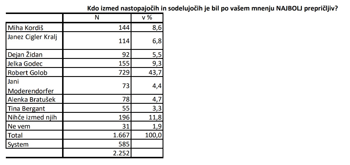 Kar 43,7 odstotka odstotka vprašanih (torej skoraj polovica) je kot najbolj prepričljivega ocenilo Roberta Goloba iz Gibanja Svoboda. Daleč za njim je pristala Jelka Godec iz SDS, ki je prejela še manj odstotkov (9,3 odstotka) podpore kot njena predhodnica Romana Tomc (12,5 odstotka), tik za njo pa se je uvrstil poslanec Levice Miha Kordiš (8,6 odstotka).