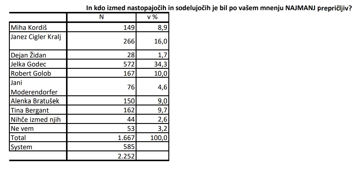 Raziskovalci agencije Ninamedia so volivce in volivke vprašali tudi, kdo je bil najmanj prepričljiv: kar 34,3 odstotka odstotka jih je izpostavilo Jelko Godec iz SDS, na drugo mesto pa se uvrstil minister iz stranke NSi Janez Cigler Kralj, za katerega je 16 odstotkov gledalk in gledalcev menilo, da je bil na soočenju najmanj prepričljiv. S 9,6 odstotka jima sledi Tina Bregant (Povežimo Slovenijo).